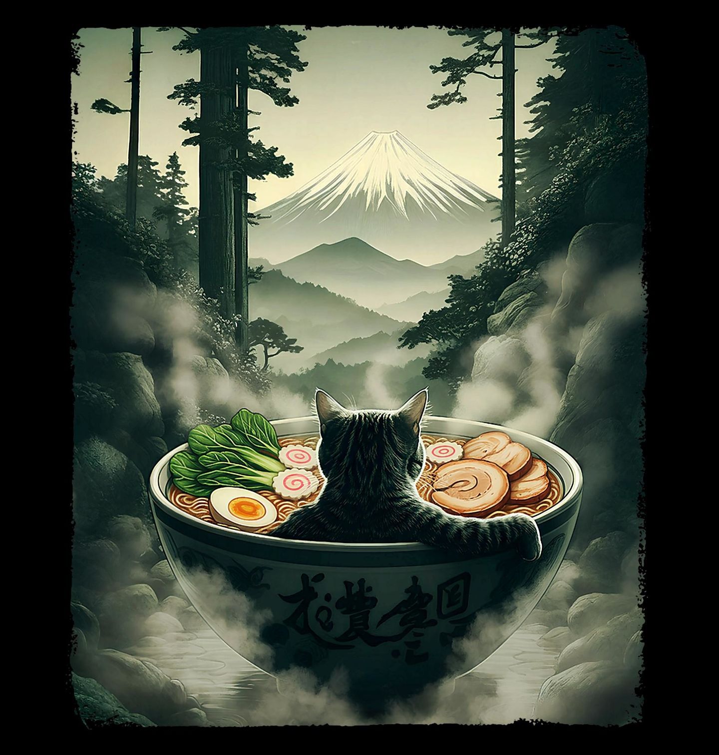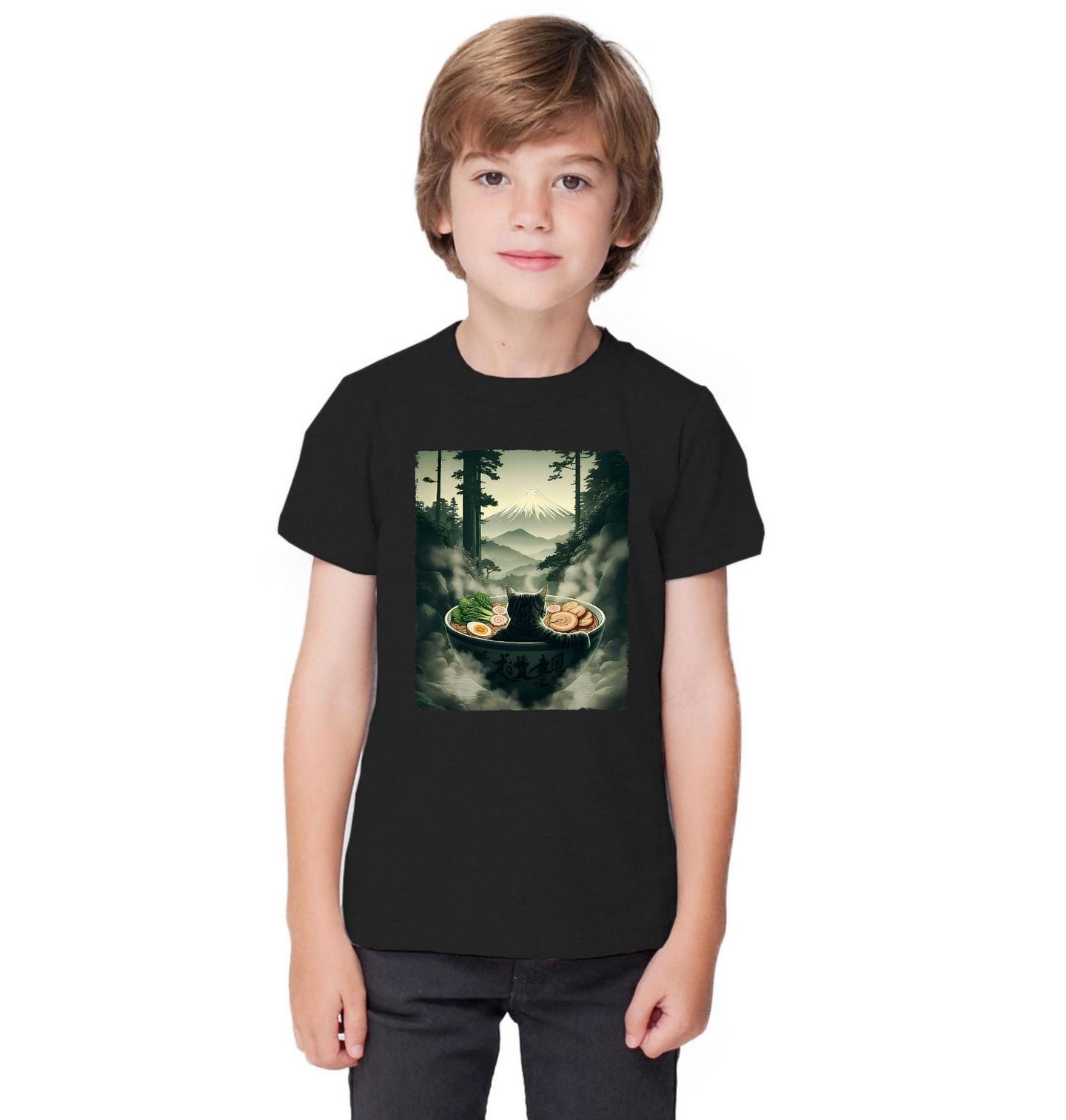 Dětské tričko Kočka v Misce Ramenu před Horou Fuji. Kočka si užívá relax v obří misce horkého ramenu, zatímco obdivuje majestátní horu Fuji. Motiv evokuje atmosféru tradičních japonských onsenu, kde se snoubí pohoda, jídlo a harmonie s přírodou. Ideální pro každého, kdo miluje Japonsko, jeho kuchyni a samozřejmě i kočky.