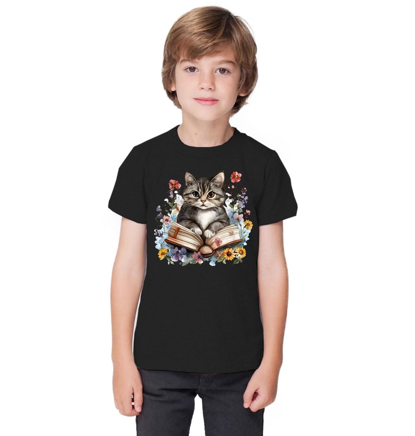 Dětské tričko Kočka v Říši Příběhů. Ilustrace zachycuje roztomilou postavu, kterou je kočka ponořená do světa fantazie, zatímco před sebou má otevřenou kniha obklopenou květinami a jemnými akvarelovými detaily. Tento design působí uklidňujícím dojmem a připomíná krásu tichých momentů, kdy se člověk může ztratit v příběhu. Kočka zde symbolizuje zvědavost a klid, zatímco čtení a kniha představují cestu do jiných světů.
