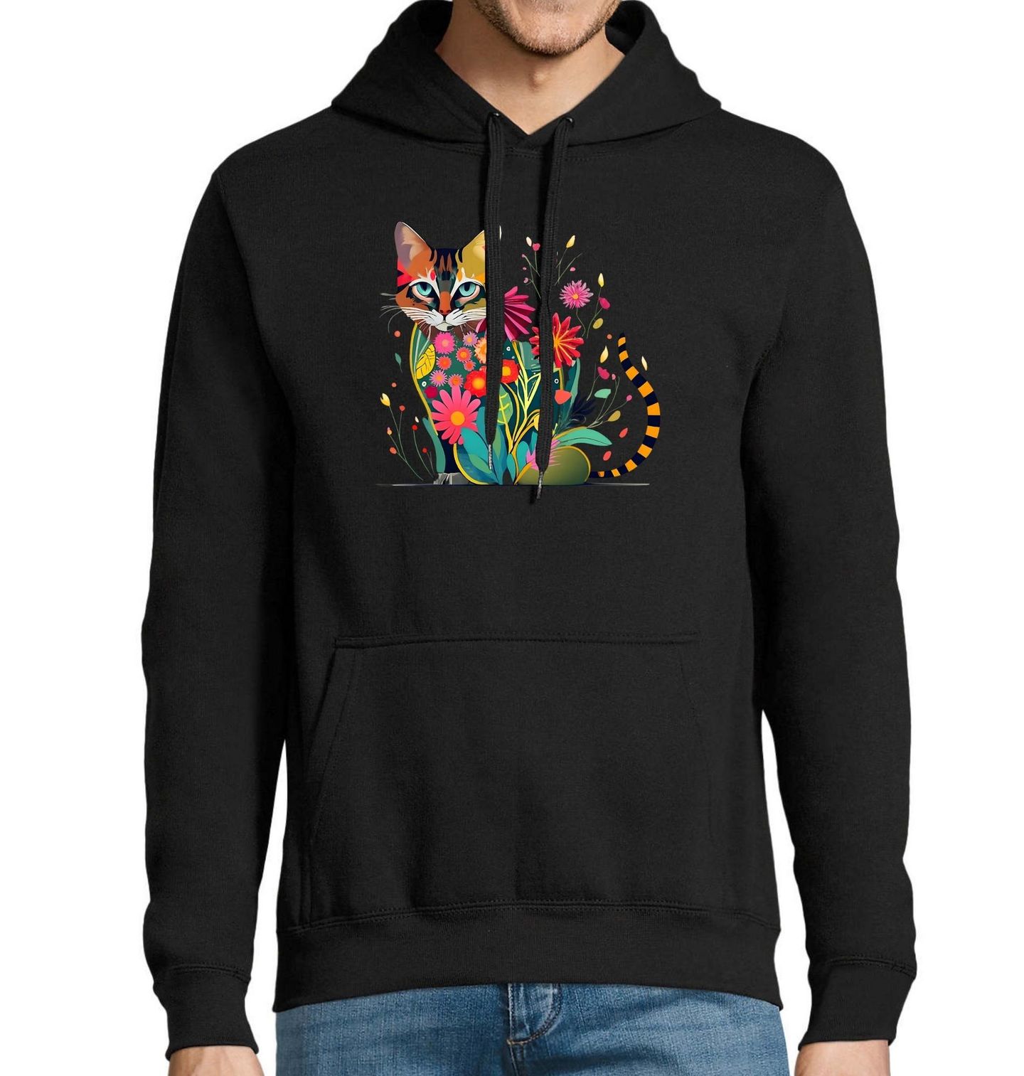 Pánská mikina Kočka v Rozkvětu. Stylové tričko s originálním motivem, kde kočka splývá s pestrou zahradou plnou květin. Tento barevný a moderní design potěší každého milovníka koček i přírody. Kočka je ztvárněna v uměleckém stylu s živými barvami a květiny dodávají motivu hravost i eleganci. Perfektní volba pro ty, kteří chtějí nosit kousek léta po celý rok.