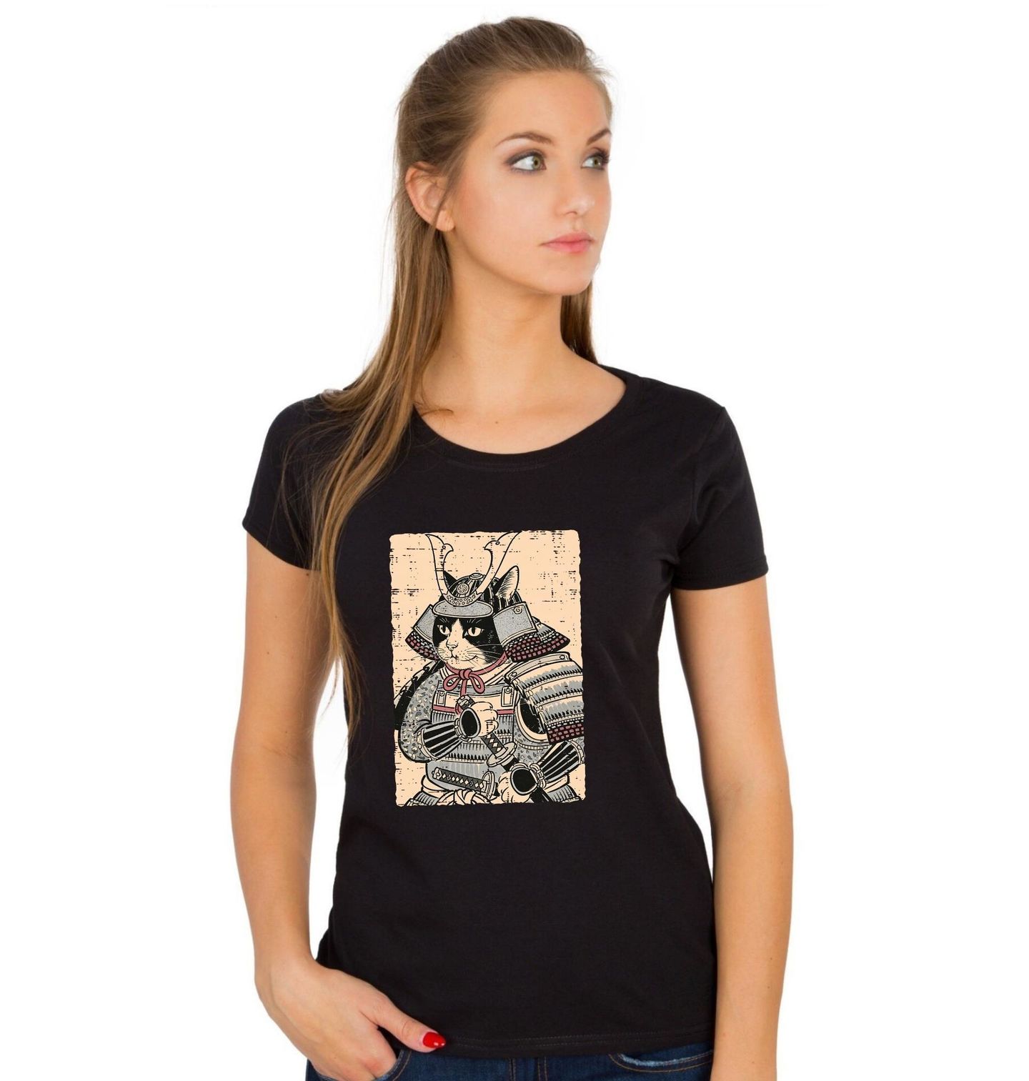 Dámské tričko Kočka v Samurajské Zbroji Ukiyo-e Art. Styl ilustrace je inspirovaný Edo obdobím a Ukiyo-e estetikou, ale samotná výstroj je klasická samurajská bojová zbroj. Kočka působí hrdě, klidně a odhodlaně — jako pravý samurajský válečník. Tento motiv ocení všichni kdo milují kočky a Japonsko.