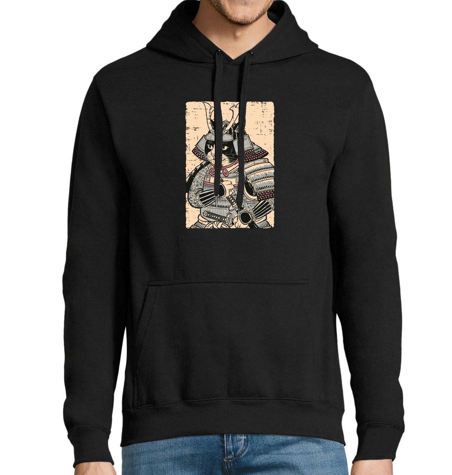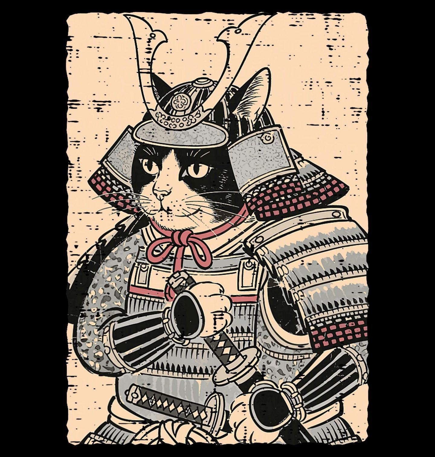 Pánská mikina Kočka v Samurajské Zbroji Ukiyo-e Art. Styl ilustrace je inspirovaný Edo obdobím a Ukiyo-e estetikou, ale samotná výstroj je klasická samurajská bojová zbroj. Kočka působí hrdě, klidně a odhodlaně — jako pravý samurajský válečník. Tento motiv ocení všichni kdo milují kočky a Japonsko.