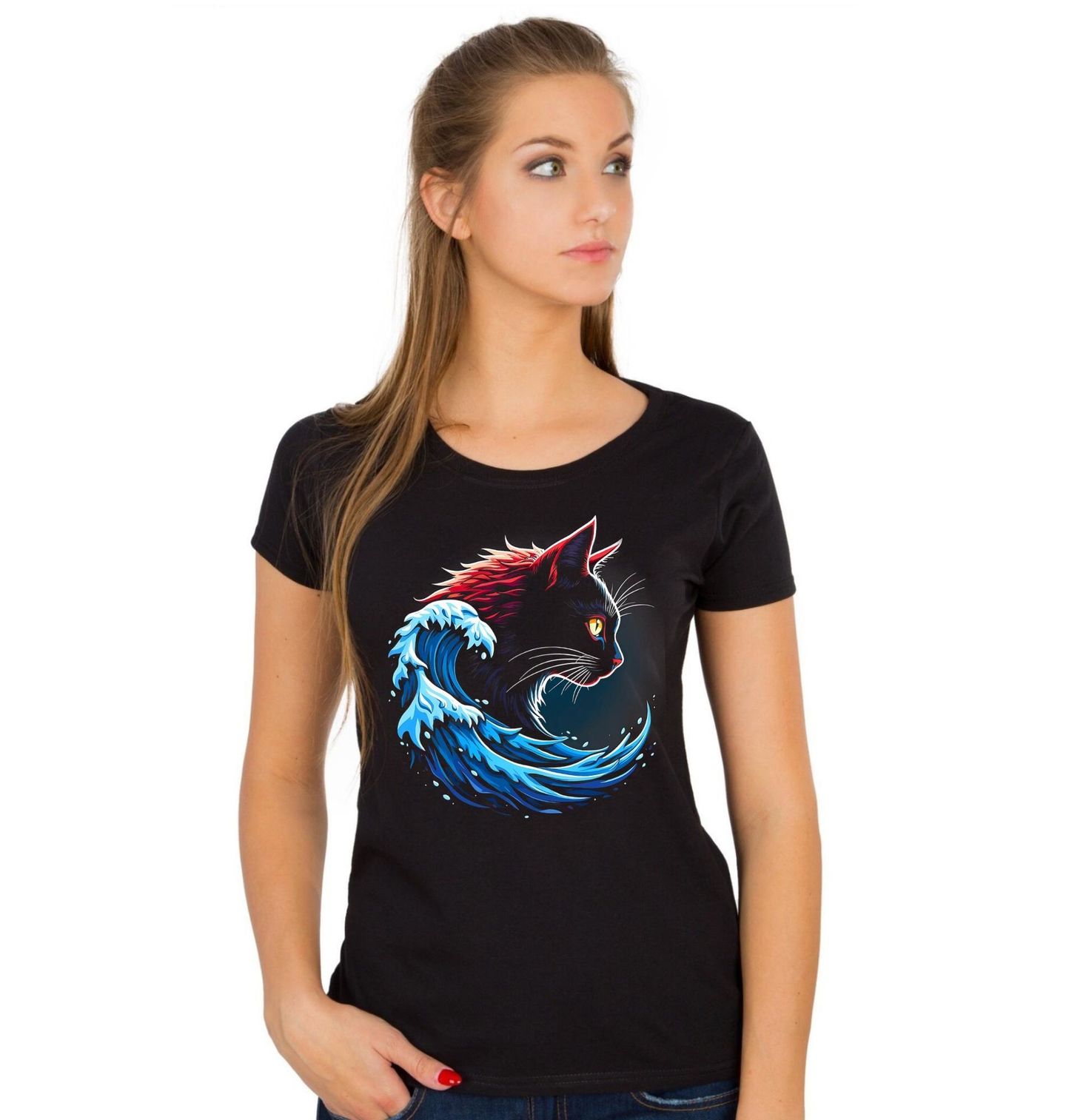 Dámské tričko Kočka ve Vlnách Moře Blue Cat Wave. Výrazný a moderní motiv, kde se elegantní kočka propojuje s dynamickou vlna inspirovanou silou moře. Tento design kombinuje kontrastní barvy a energii pohybu, čímž vytváří jedinečný a nepřehlédnutelný styl. Ideální pro milovníky koček, přírody i výrazného designu.
