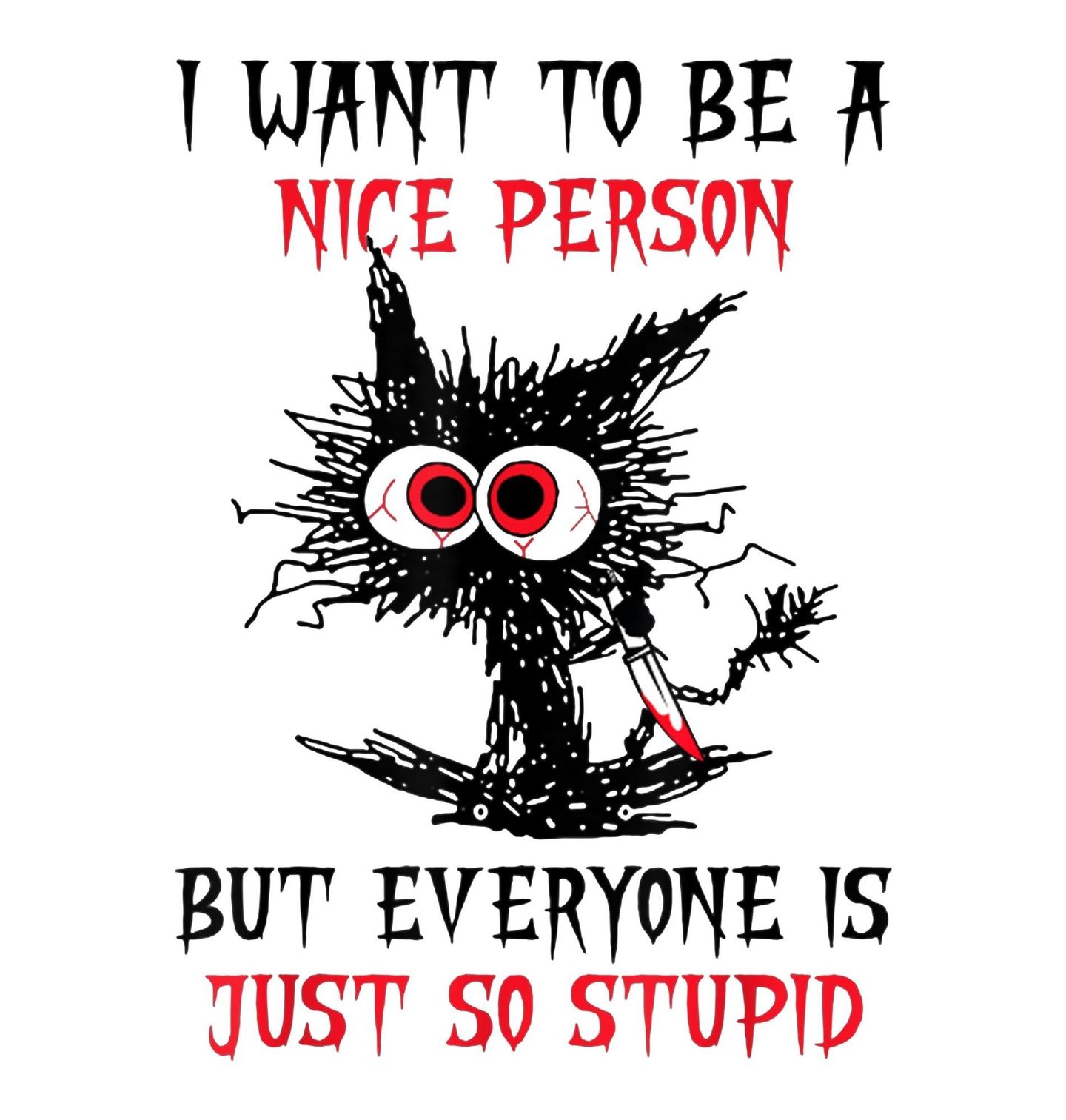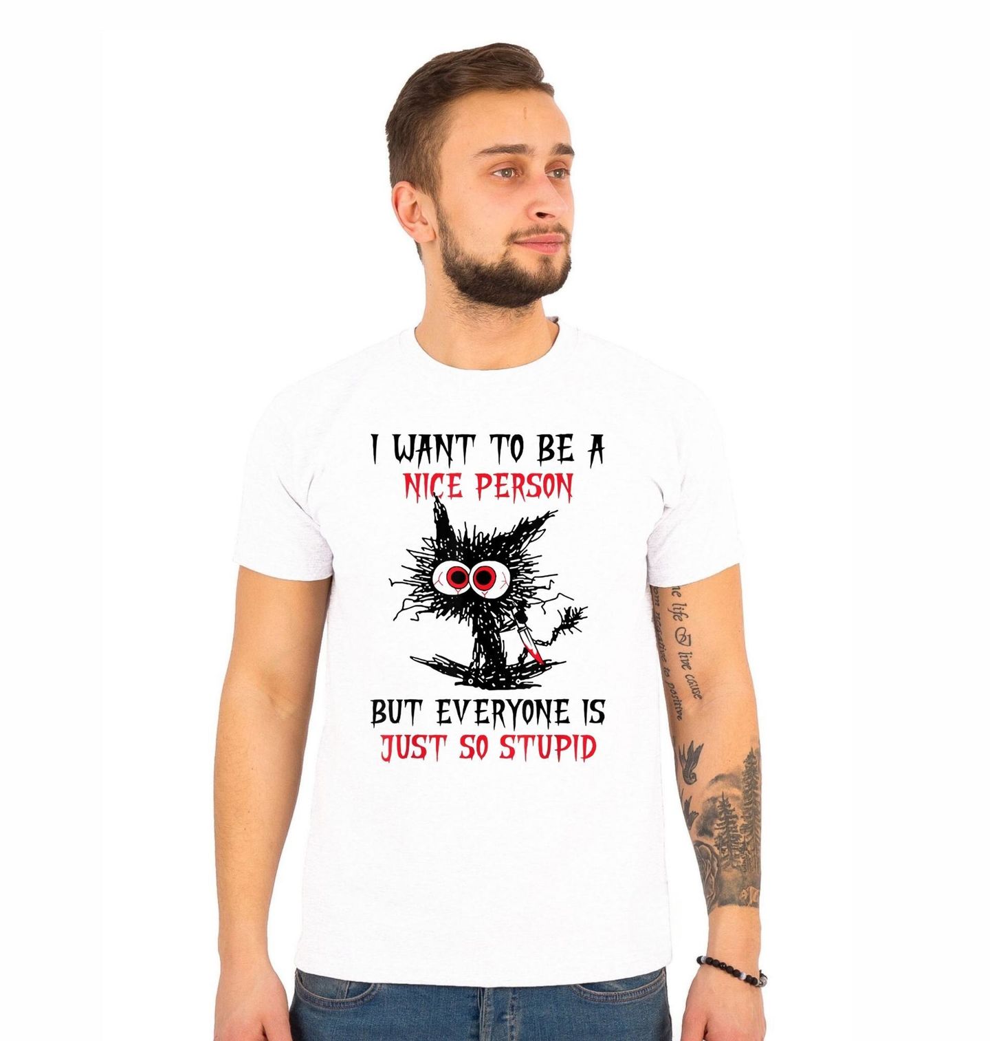 Pánské tričko Kočka Vrah. Sarkastický motiv černé rozcuchané kočky s nožem v ruce. A text, co říká „I WANT TO BE A NICE PERSON BUT EVERYONE IS JUST SO STUPID“, tedy „Chci být milý člověk, ale všichni jsou tak hloupí“. Výrazná kresba dodává motivu drsný humor.