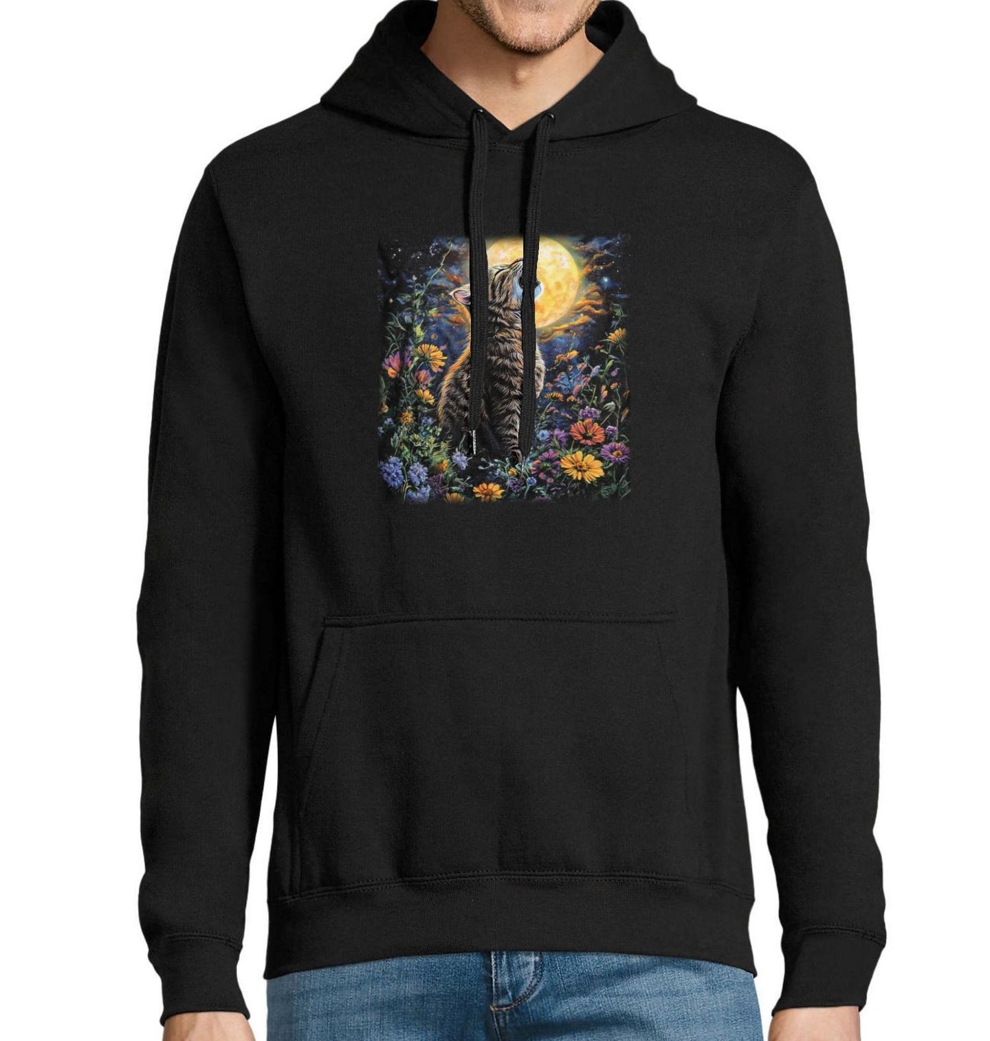 Pánská mikina Kočka vyjící na Měsíc. Kočka, která mňouká na Měsíc, sedí v rozkvetlé louce a hledí k měsíci, jako by v jeho světle našla své noční tajemství. Mezi pestrými květinami a hvězdami zářícími na obloze se tahle kočičí silueta stává symbolem klidu, elegance a trochu tajemna.