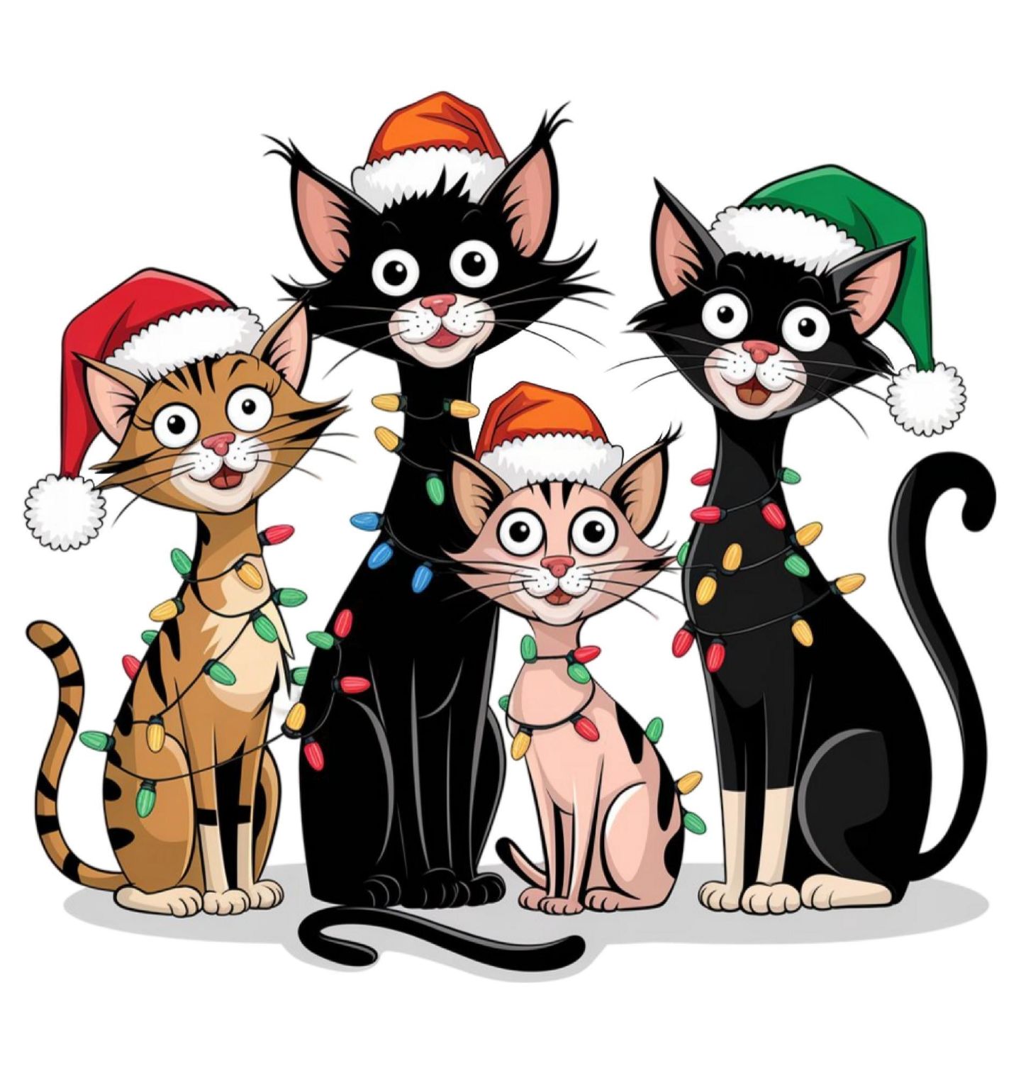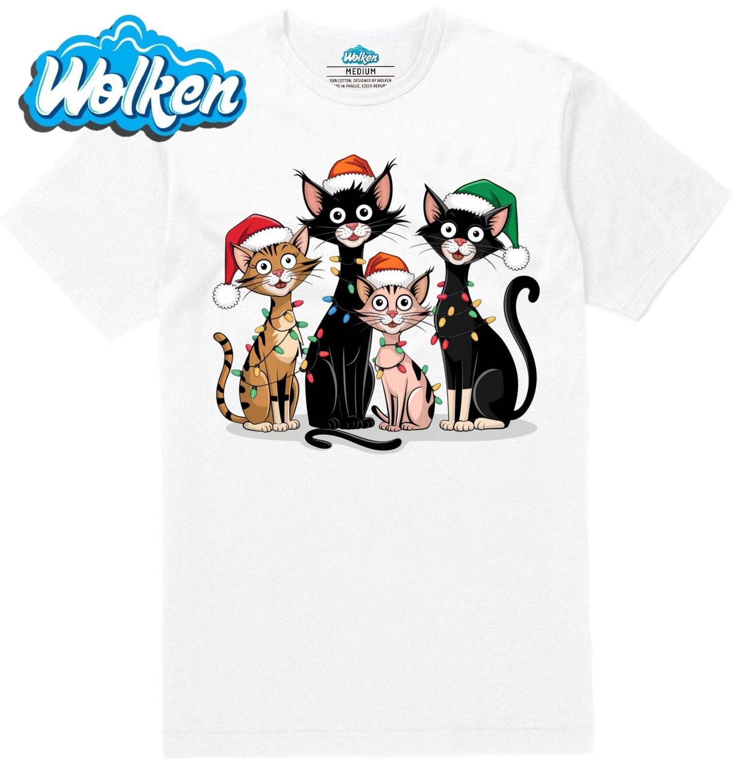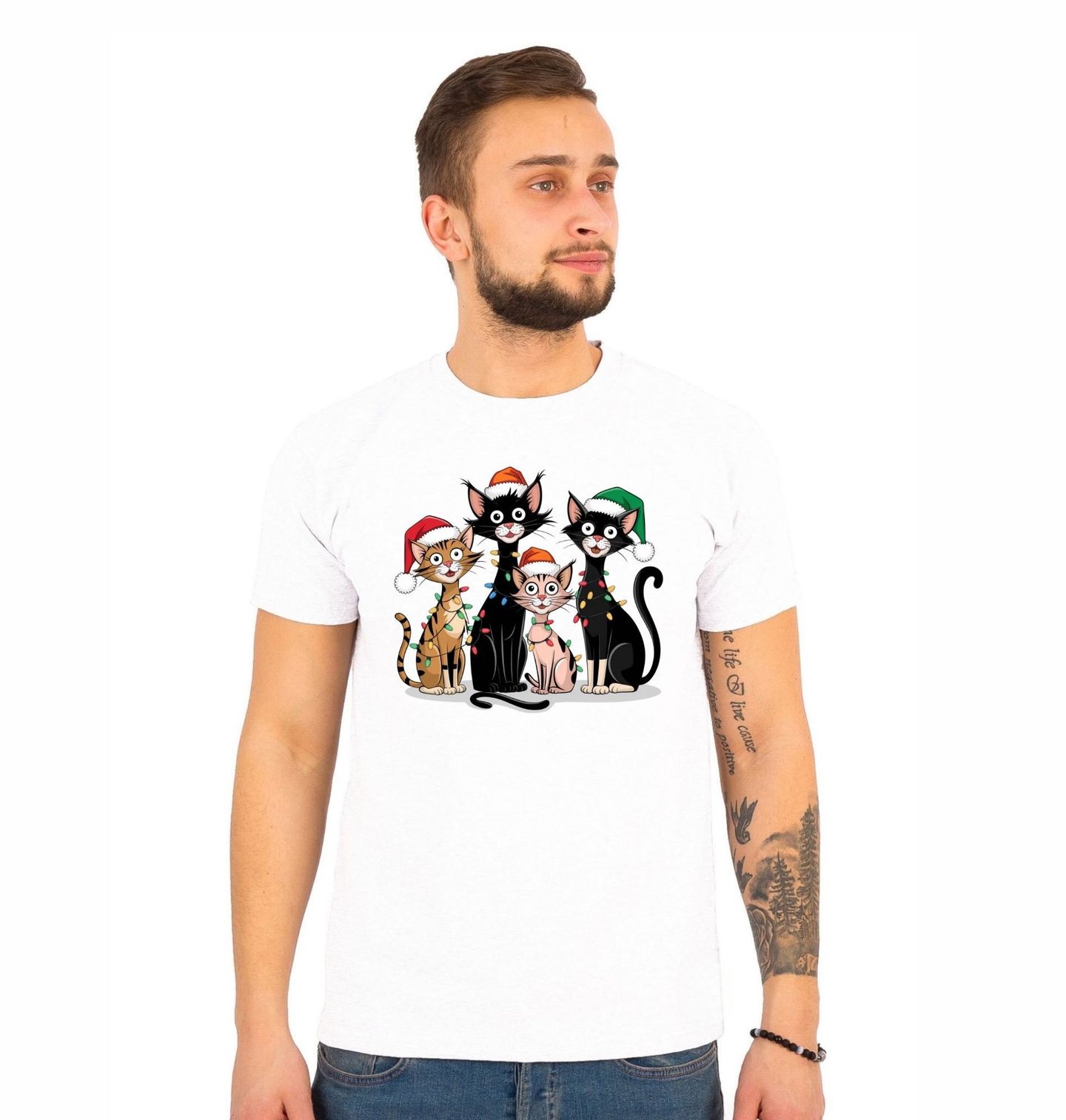Pánské tričko Kočky ve Vánočních Čepicích. Čtyři hravé kočky oblečené do vánočních čepic a omotané barevnými světýlky. Tento veselý motiv dokonale vystihuje vánoční atmosféru a přináší radost každému milovníkovi koček. Ideální pro všechny, kdo chtějí ozdobit své Vánoce roztomilými kočkami a sváteční náladou.