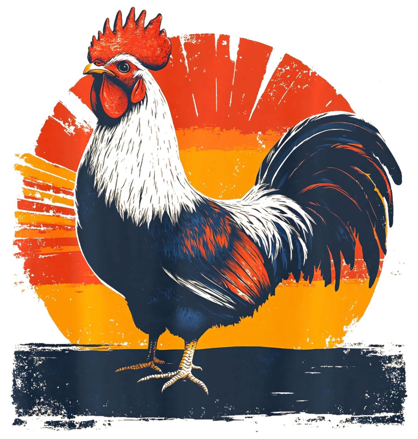 Dámské tričko Kohout při Východu Slunce. Stylový motiv zobrazuje kohouta stojícího před výrazným retro východem slunce v teplých barvách. Kombinace vintage grafiky a výrazných linií vytváří nadčasový motiv inspirovaný farmářským životem a přírodou. Kohout je symbolem venkova, svobody a ranní energie, která začíná každý nový den.