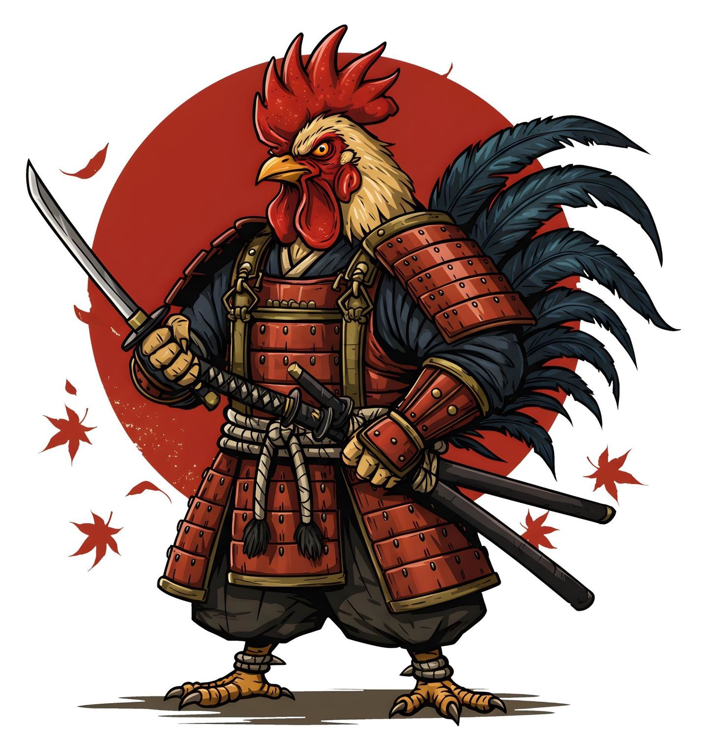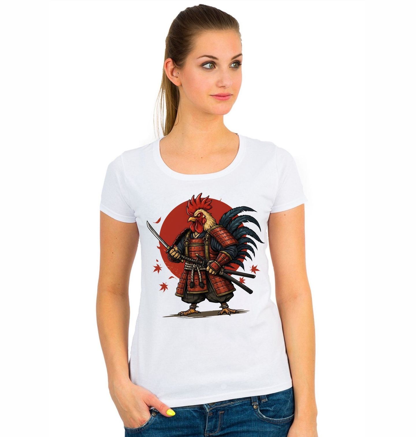Dámské tričko Kohout Samuraj. Kohoutí samuraj je jedinečný motiv, který kombinuje sílu bojovníka s kohoutí odvahou. Na motivu jsou japonský samuraj, tradiční katana, majestátní slepice a prvky inspirované slepičí říší – vše ve stylu válečníka připraveného bránit své území. Ideální pro všechny, kteří milují Japonsko, bojové umění i humor.