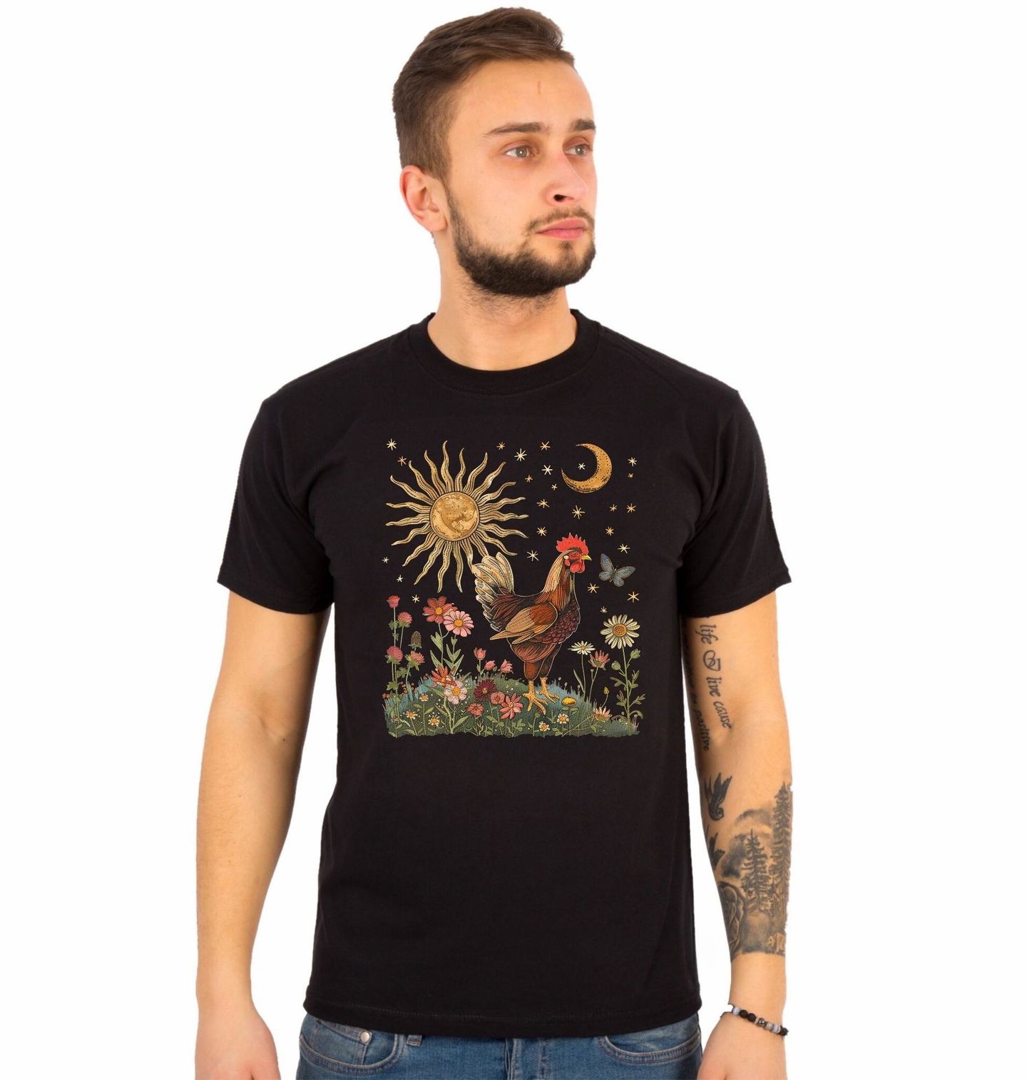 Pánské tričko Kohout Slunce a Květiny. Detailní umělecký motiv zachycuje kohouta stojícího mezi rozkvetlými květinami, nad kterým září slunce a měsíc doprovázený hvězdami. Obrázek neobsahuje text, ale vypráví příběh harmonie přírody, venkovského života a cyklu dne a noci. Jemné ilustrace a přírodní barvy vytvářejí elegantní a klidnou atmosféru.