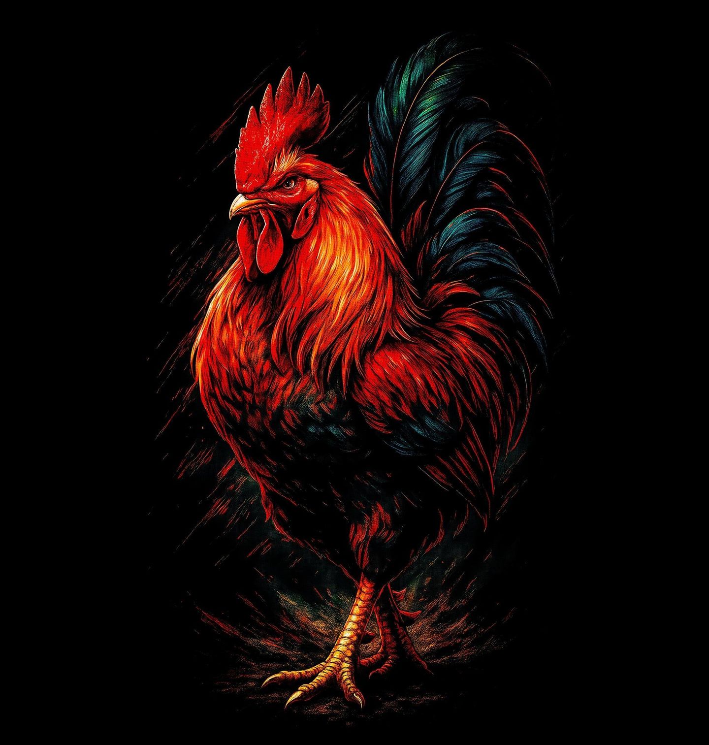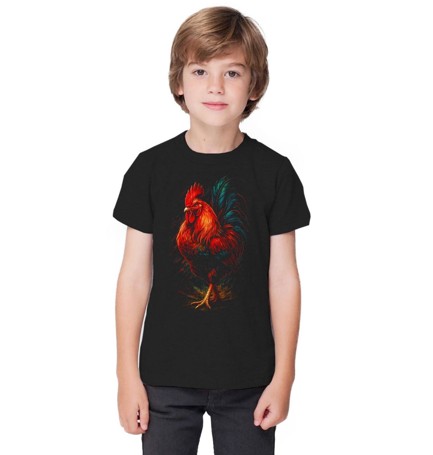 Dětské tričko Kohout Strážce Dvora. Tento detailně zpracovaný kohout symbolizuje sílu, hrdost a dominanci typickou pro každou farmu. Jako tradiční pták venkova je kohout neodmyslitelným symbolem ranního života na statku a poctivé farmářské práce. Ideální volba pro každého, kdo má blízko k přírodě, zvířatům a autentickému stylu farmy.