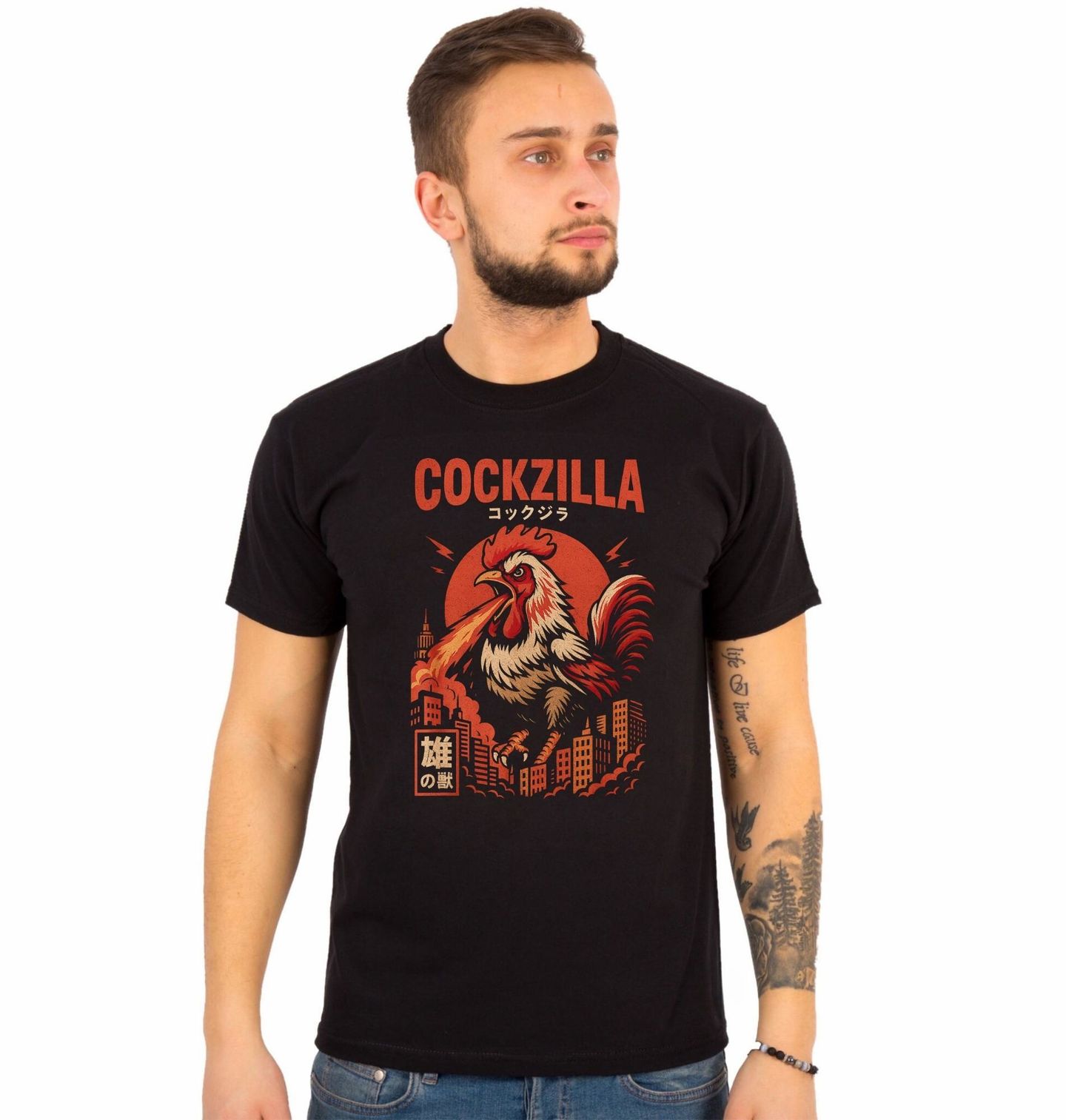 Pánské tričko Kohoutí Godzilla Cockzilla. Originální design zachycuje gigantického kohouta ničícího město ve stylu filmových monster. Nápis „COCKZILLA“ odkazuje na slavnou Godzillu a japonský text doplňuje autentickou atmosféru – „コックジラ“ (foneticky Cockzilla). Tento design je ideální pro milovníky humoru a filmových parodií.