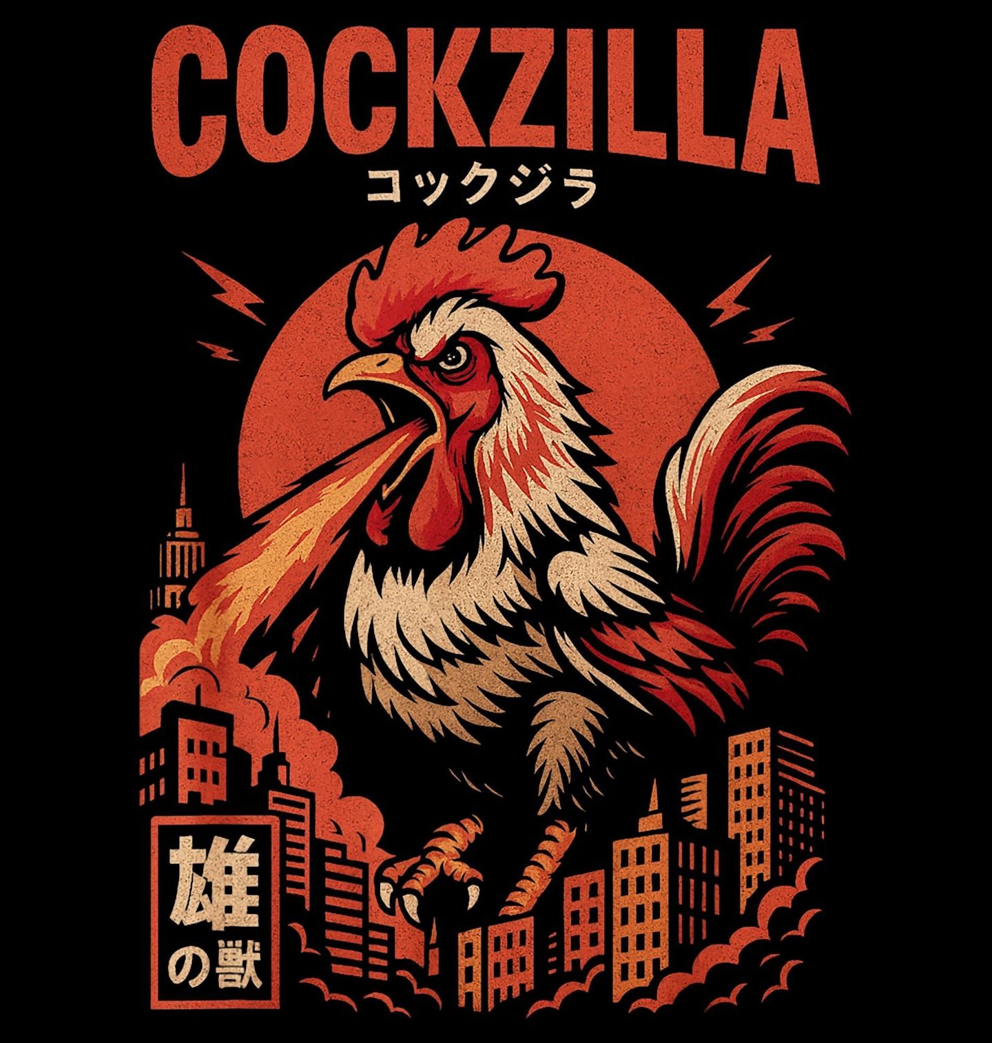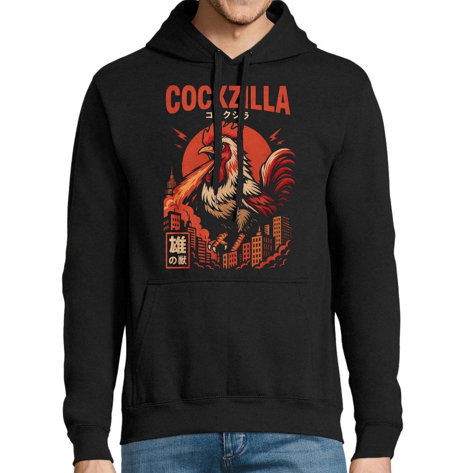 Pánská mikina Kohoutí Godzilla Cockzilla. Originální design zachycuje gigantického kohouta ničícího město ve stylu filmových monster. Nápis „COCKZILLA“ odkazuje na slavnou Godzillu a japonský text doplňuje autentickou atmosféru – „コックジラ“ (foneticky Cockzilla). Tento design je ideální pro milovníky humoru a filmových parodií.