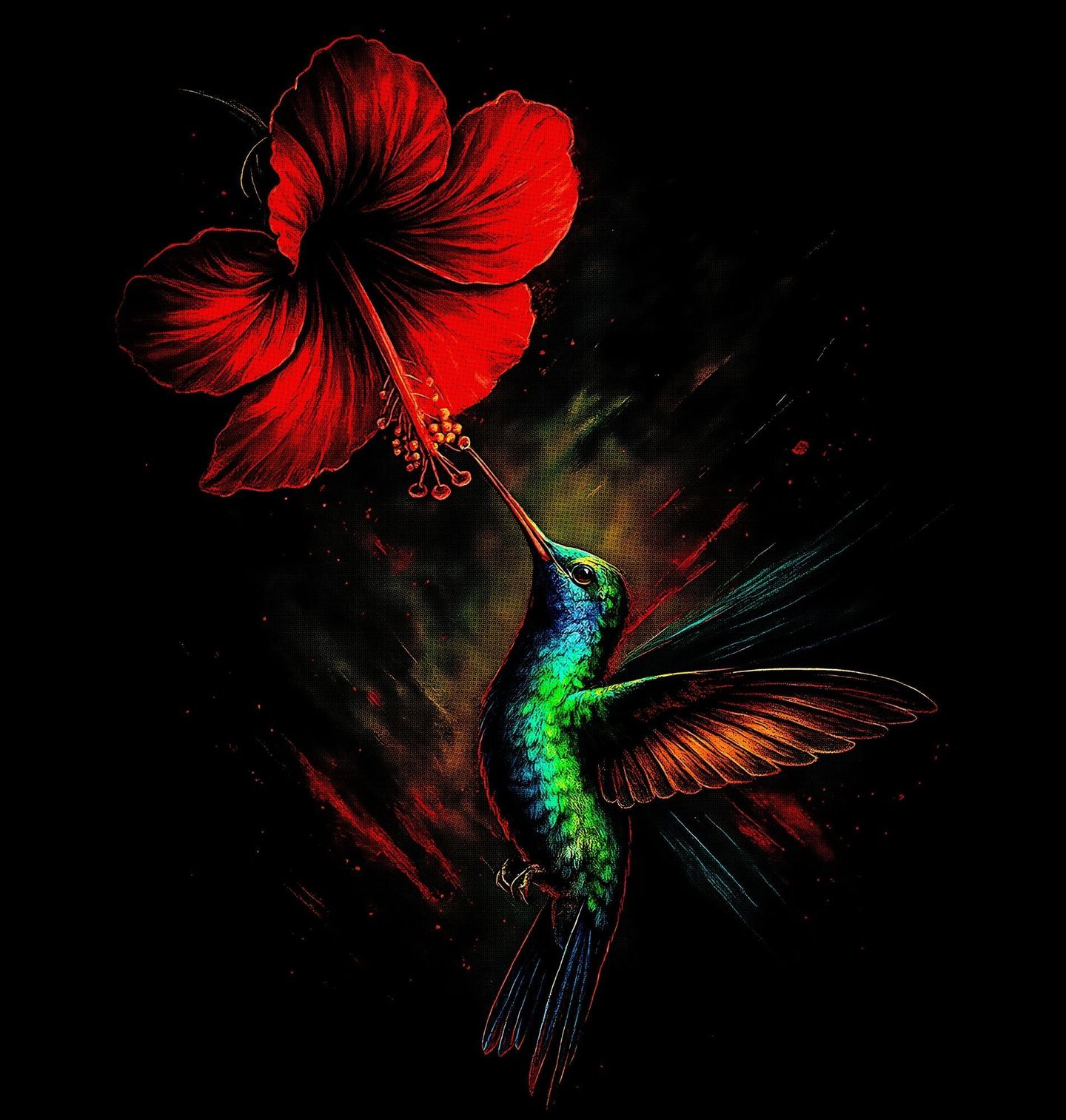 Pánské tričko Kolibřík modroocasý. Drobný, ale mimořádně elegantní pták – kolibřík, v okamžiku, kdy se vznáší u květu a sbírá nektar. Zářivé barvy peří, dynamika pohybu a kontrast s výrazným květem vytvářejí harmonickou a živou kompozici plnou energie. Kolibřík je jedinečný pták, známý svou schopností letu na místě a extrémní rychlostí křídel.