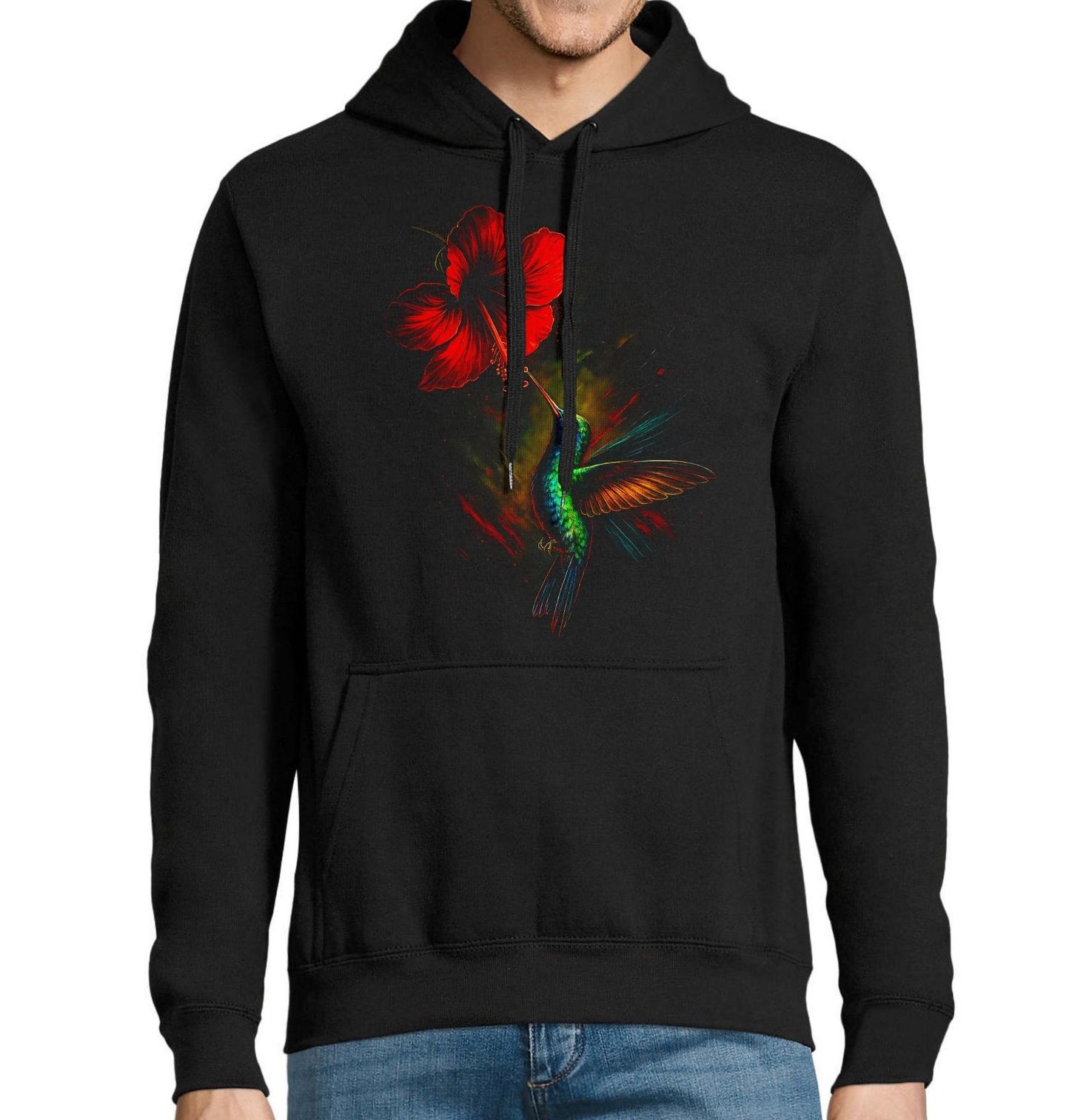 Pánská mikina Kolibřík modroocasý. Drobný, ale mimořádně elegantní pták – kolibřík, v okamžiku, kdy se vznáší u květu a sbírá nektar. Zářivé barvy peří, dynamika pohybu a kontrast s výrazným květem vytvářejí harmonickou a živou kompozici plnou energie. Kolibřík je jedinečný pták, známý svou schopností letu na místě a extrémní rychlostí křídel.