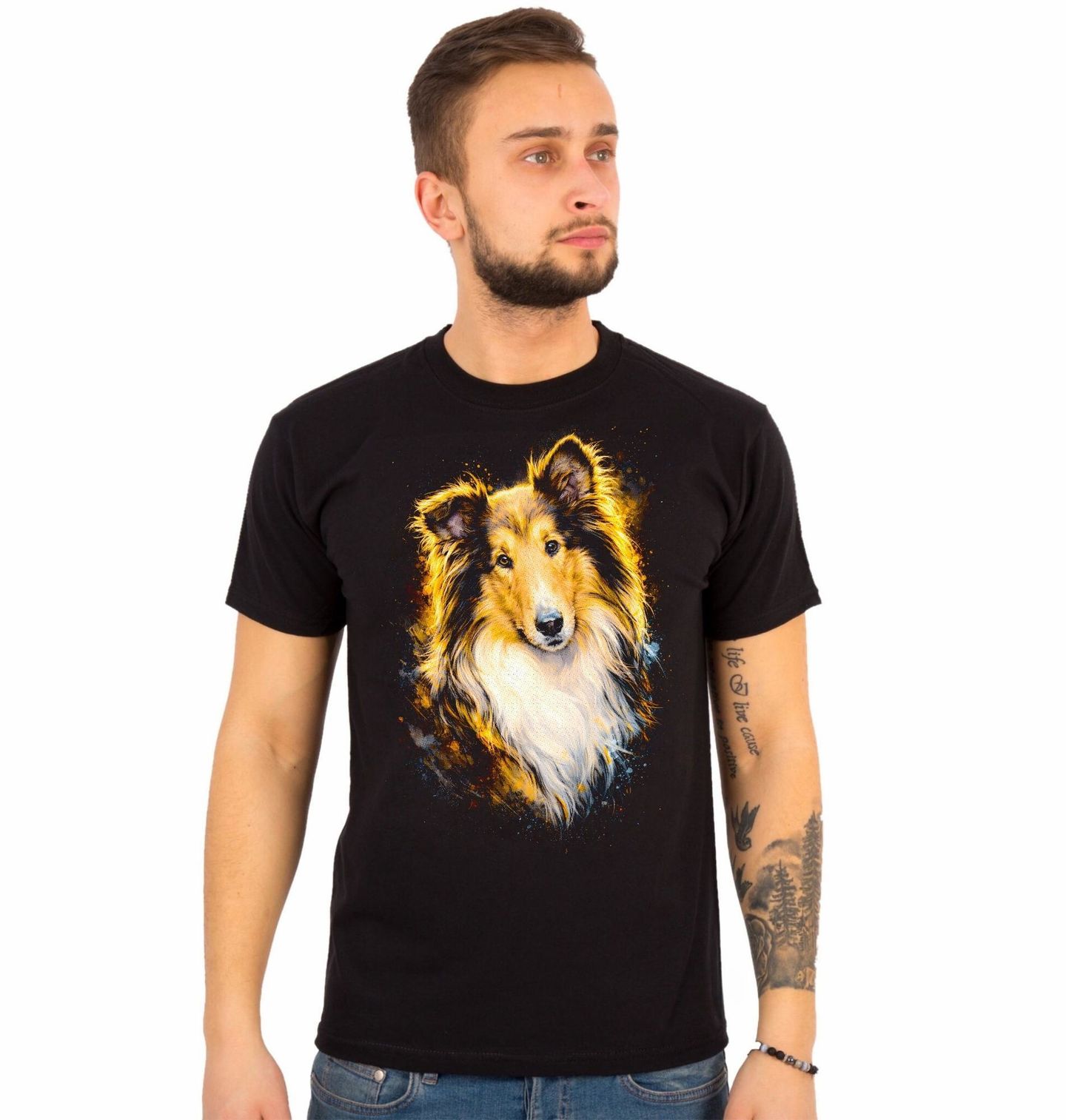 Pánské tričko Kolie dlouhosrstá. Tento krásný pes vyniká svou bohatou srstí, jemným výrazem a typickou klidnou povahou, která si získá každého milovníka psů. Každý pejskař ocení detailní zpracování srsti i něžný pohled, který dokonale vystihuje přátelskou a citlivou povahu tohoto plemene. Kolie dlouhosrstá je známá svou vysokou inteligencí, loajalitou a silným vztahem ke své rodině, což z ní dělá ideálního společníka.