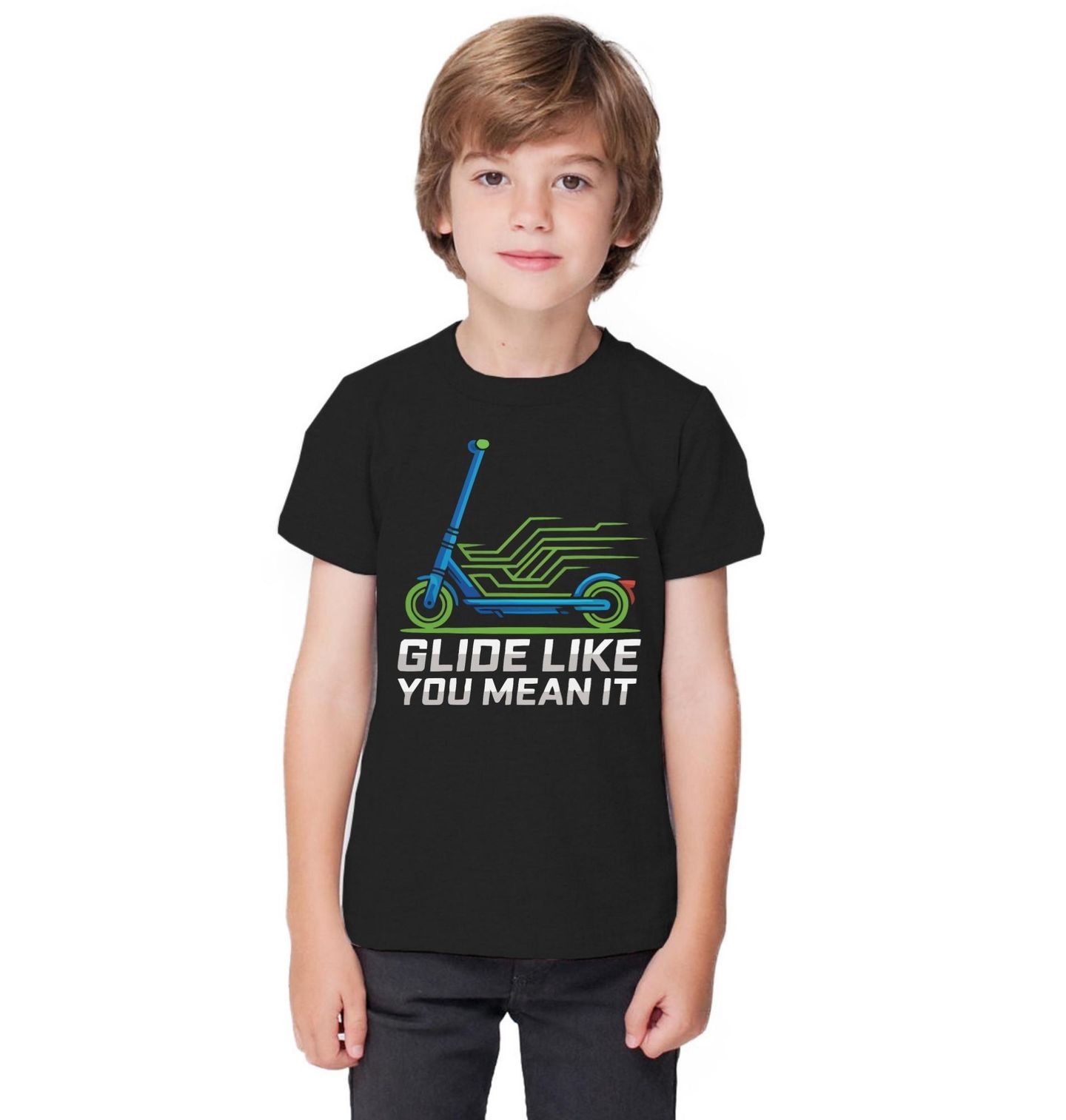 Dětské tričko Koloběžka Glide Like You Mean It. Moderní design s koloběžkou a dynamickými liniemi zdůrazňuje rychlost a plynulý pohyb. Text „Glide like you mean it“ znamená „Jezdi, jako bys to myslel vážně“, což motivuje k akci a sebevědomé jízdě. Vhodný dárek pro každého vášnivého koloběžkáře.