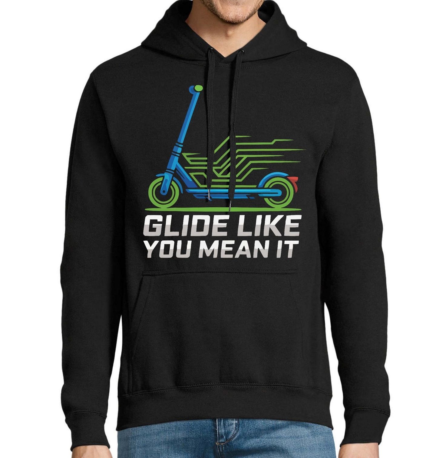 Pánská mikina Koloběžka Glide Like You Mean It. Moderní design s koloběžkou a dynamickými liniemi zdůrazňuje rychlost a plynulý pohyb. Text „Glide like you mean it“ znamená „Jezdi, jako bys to myslel vážně“, což motivuje k akci a sebevědomé jízdě. Vhodný dárek pro každého vášnivého koloběžkáře.
