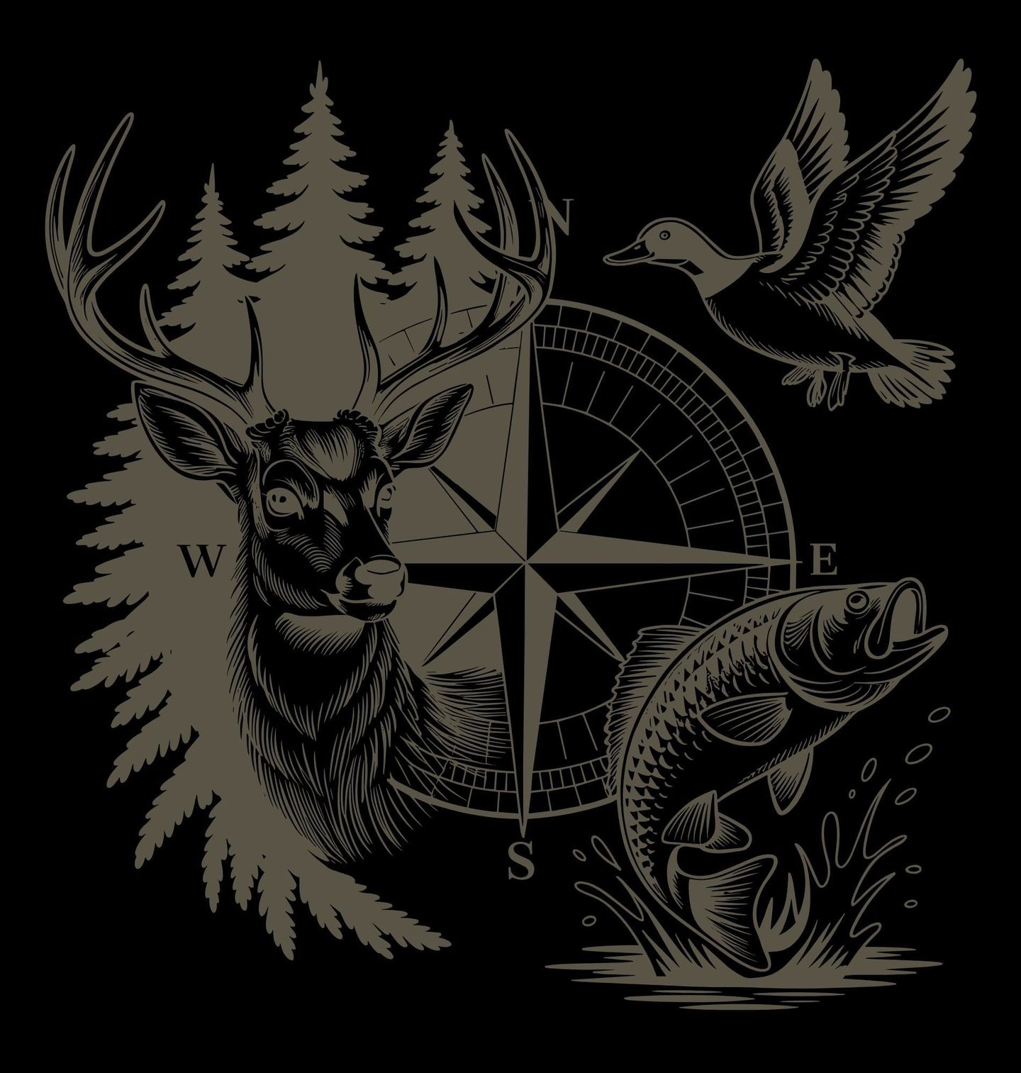 Pánská mikina Kompas Lovce v Přírodě. Stylový přírodní motiv spojuje to nejlepší z lesa i vody – v jedné kompozici je kompas, majestátní jelen, lovná kachna v letu a skákající ryba. Ideální design pro každého, kdo miluje přírodu, je vášnivý myslivec nebo zapálený rybář a rád nosí motiv, který vystihuje jeho srdce i životní směr.
