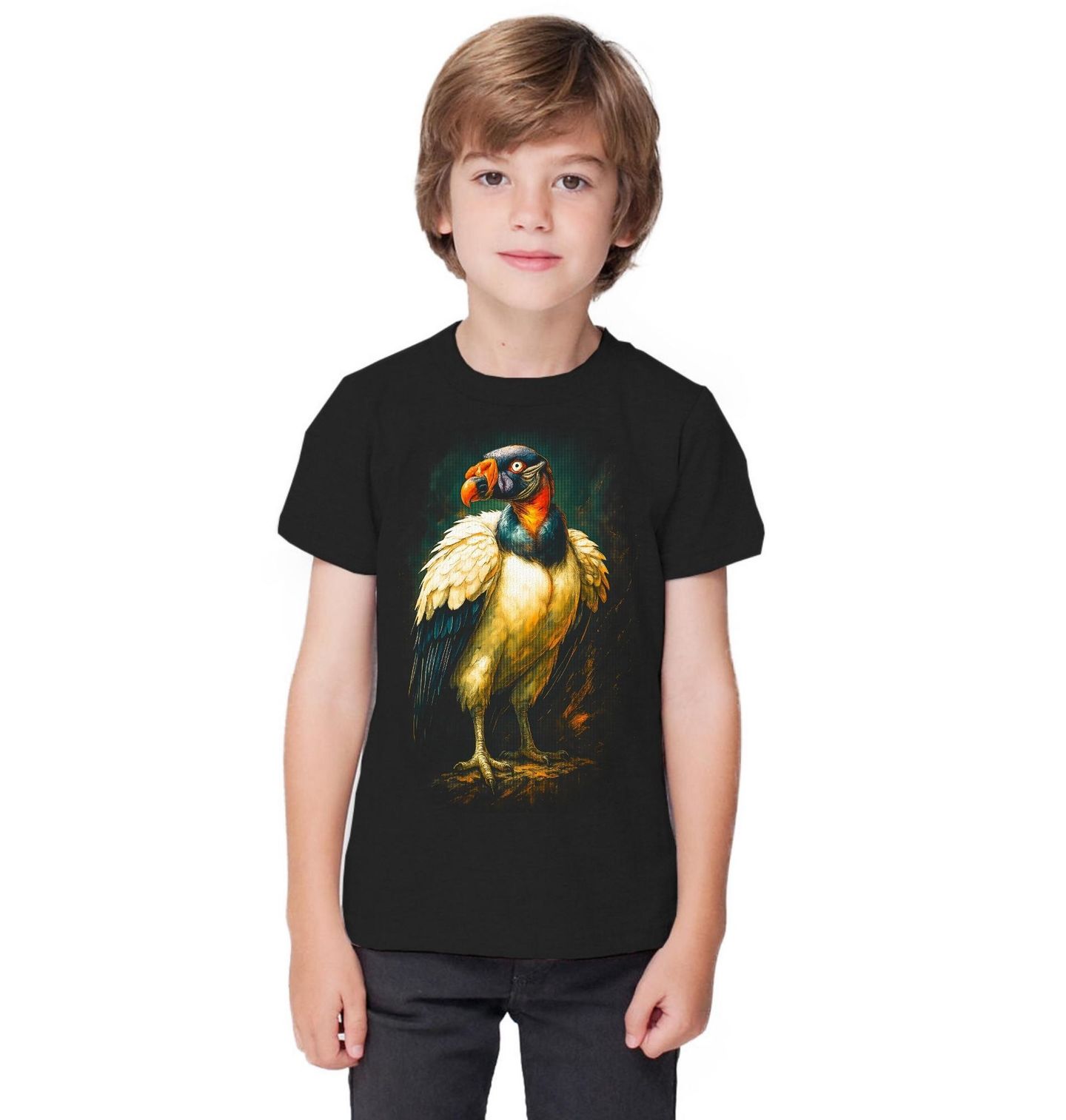 Dětské tričko Kondor královský. Výrazný motiv zobrazuje impozantní pták jménem kondor královský (Sarcoramphus papa), který patří mezi nejpůsobivější mrchožravé ptáky tropické Ameriky. Tento exotický pták je typický svou barevnou hlavou, silným zobákem a majestátním postojem, což dodává ilustraci dramatickou a zároveň elegantní atmosféru.