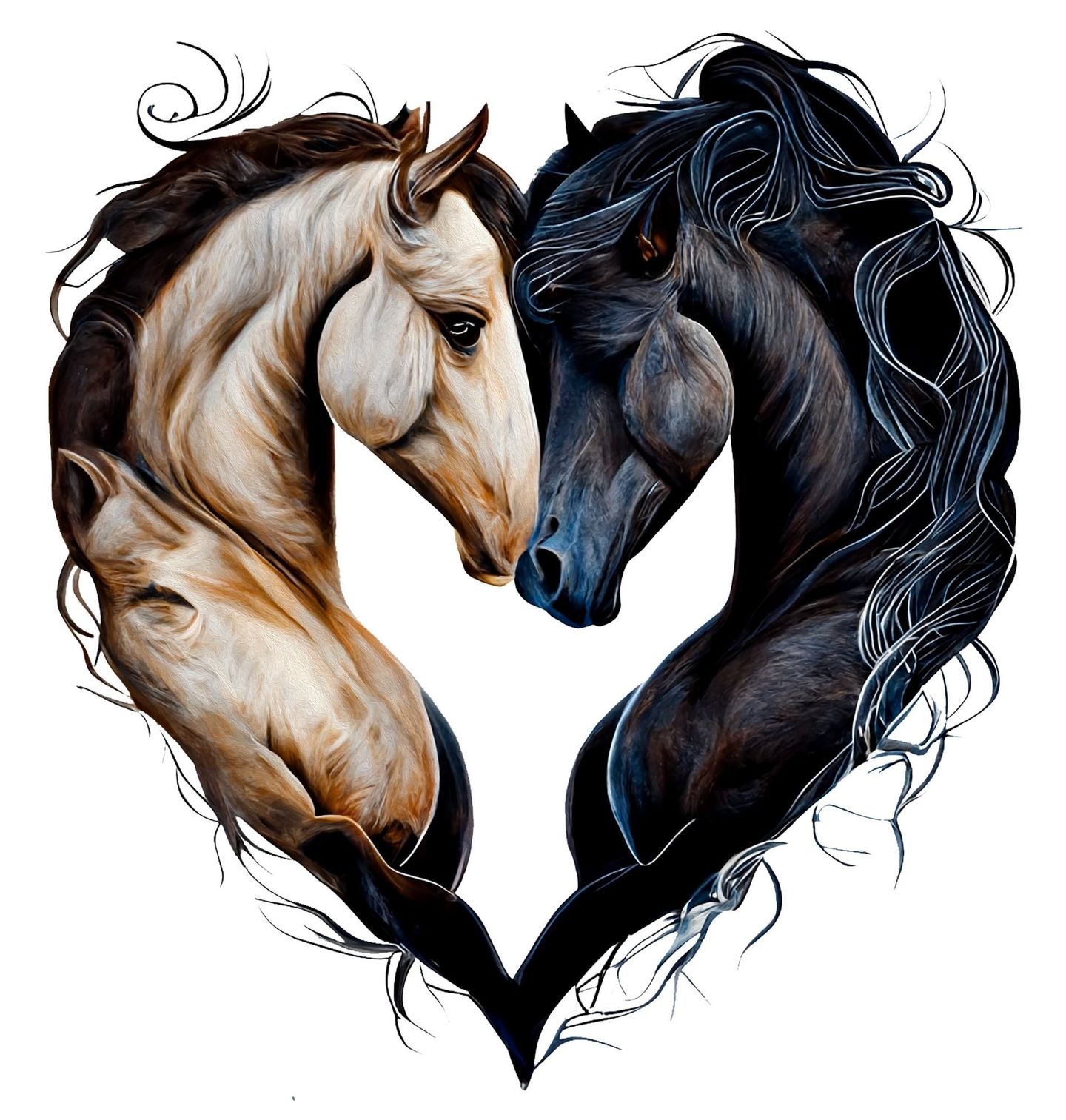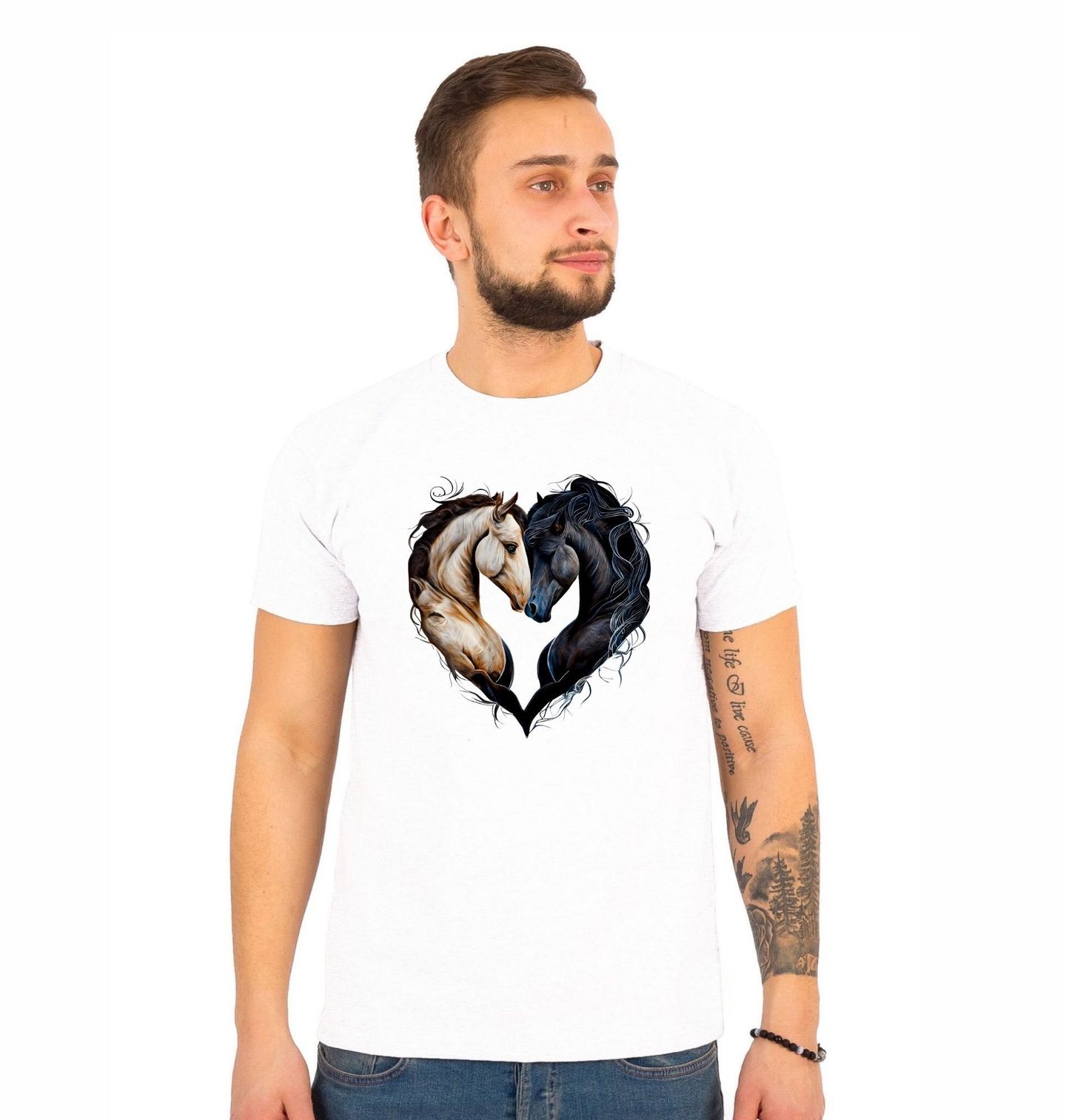 Pánské tričko Koňská Láska Černý a Světlý Kůň. Dva majestátní jedinci – světlý a tmavý – jsou k sobě otočeni tak, že jejich siluety vytvářejí dokonalé srdce. Tento obraz vyjadřuje rovnováhu protikladů, důvěru a hluboké pouto, které dokáže kůň navázat nejen s člověkem, ale i s druhým koněm.
