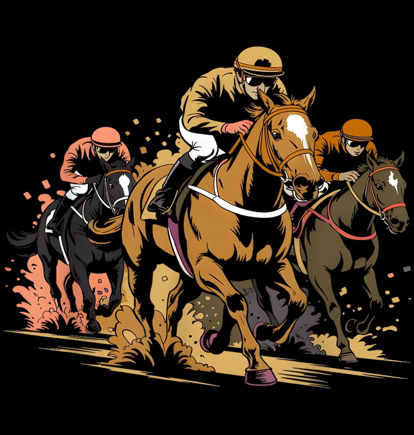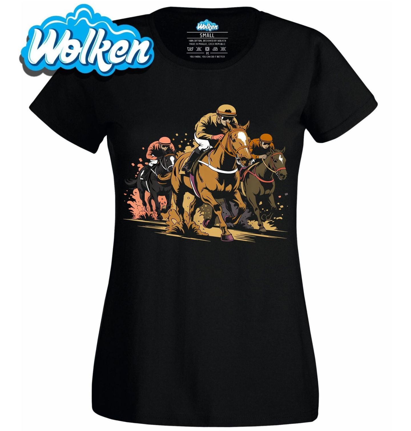 Dámské tričko Koňské Dostihy. Energie, rychlost a napětí každého dostihu – přesně to vystihuje tento originální design. V popředí se žene vpřed silný závodní kůň se svým jezdcem, následovaný dalšími soupeři. Motiv je plný dynamiky a skvěle zachycuje atmosféru koňských závodů.