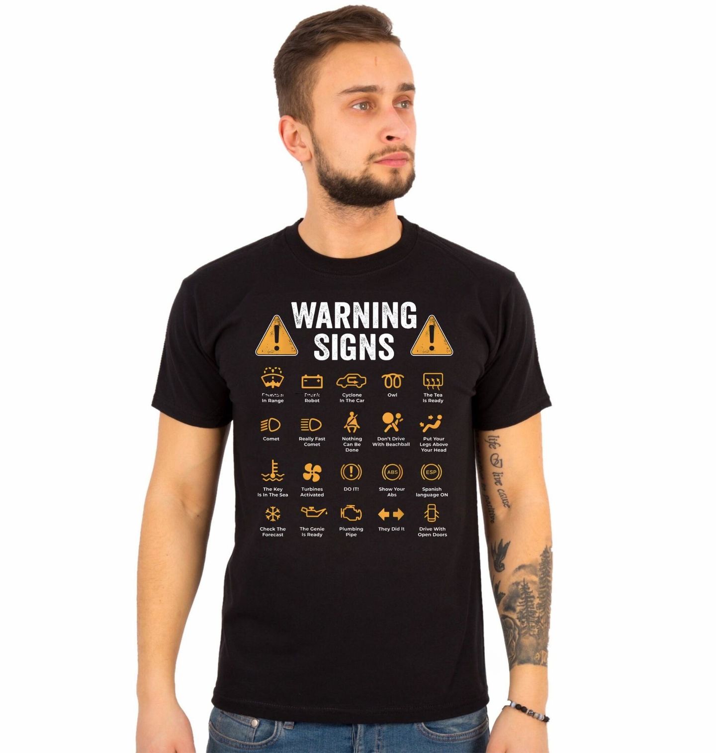 Pánské tričko Kontrolky v Autě Warning Signs. Humorný přehled kontrolek v autě, který si dělá legraci z jejich skutečného významu. Texty jako „Cyklon v autě“, „Čaj je hotový“ nebo „Ukaž břišáky“ překládají ikonky do absurdních situací. Tento motiv s tématem kontrolky auta je ideální pro řidiče se smyslem pro humor.
