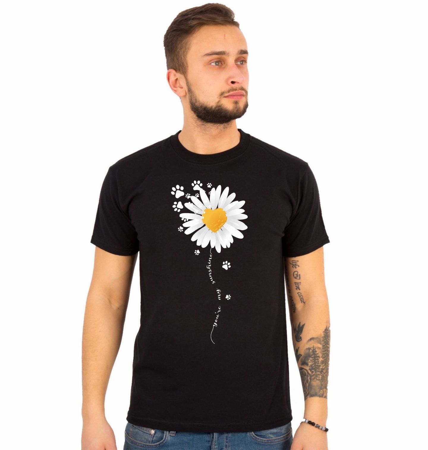 Pánské tričko Kopretina Lásky s Tlapkami. Jemný a roztomilý design s květinou a tlapkami doplňuje text „You are my sunshine“ (Jsi moje sluníčko). Tento design vyzařuje pozitivní emoce, radost a lásku ke zvířatům, což z něj dělá perfektní motiv pro každého milovníka něhy a přírody.