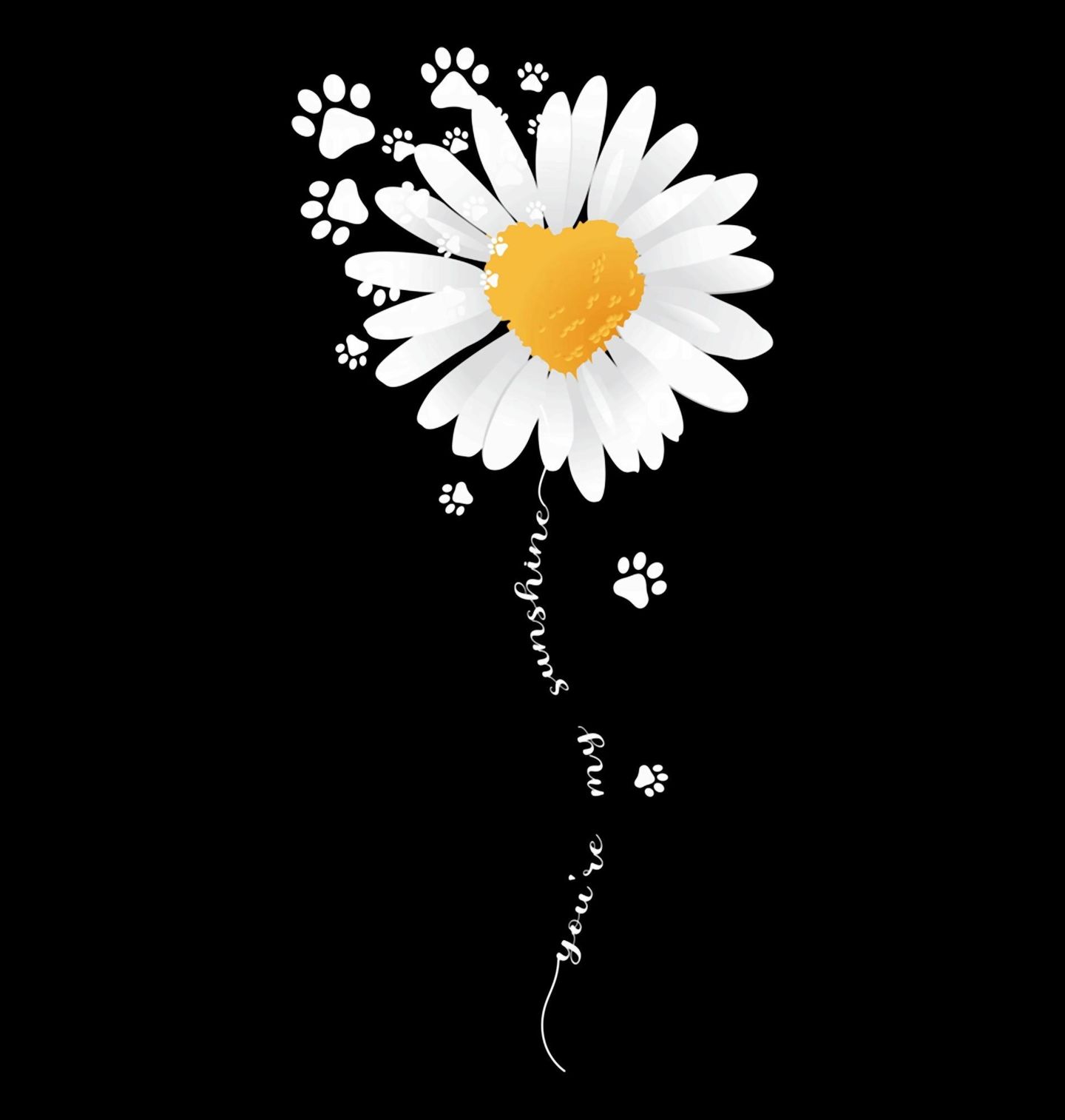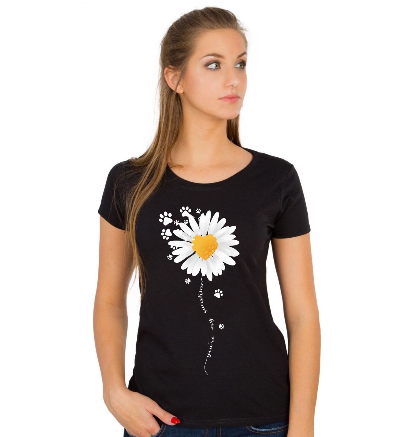 Dámské tričko Kopretina Lásky s Tlapkami. Jemný a roztomilý design s květinou a tlapkami doplňuje text „You are my sunshine“ (Jsi moje sluníčko). Tento design vyzařuje pozitivní emoce, radost a lásku ke zvířatům, což z něj dělá perfektní motiv pro každého milovníka něhy a přírody.