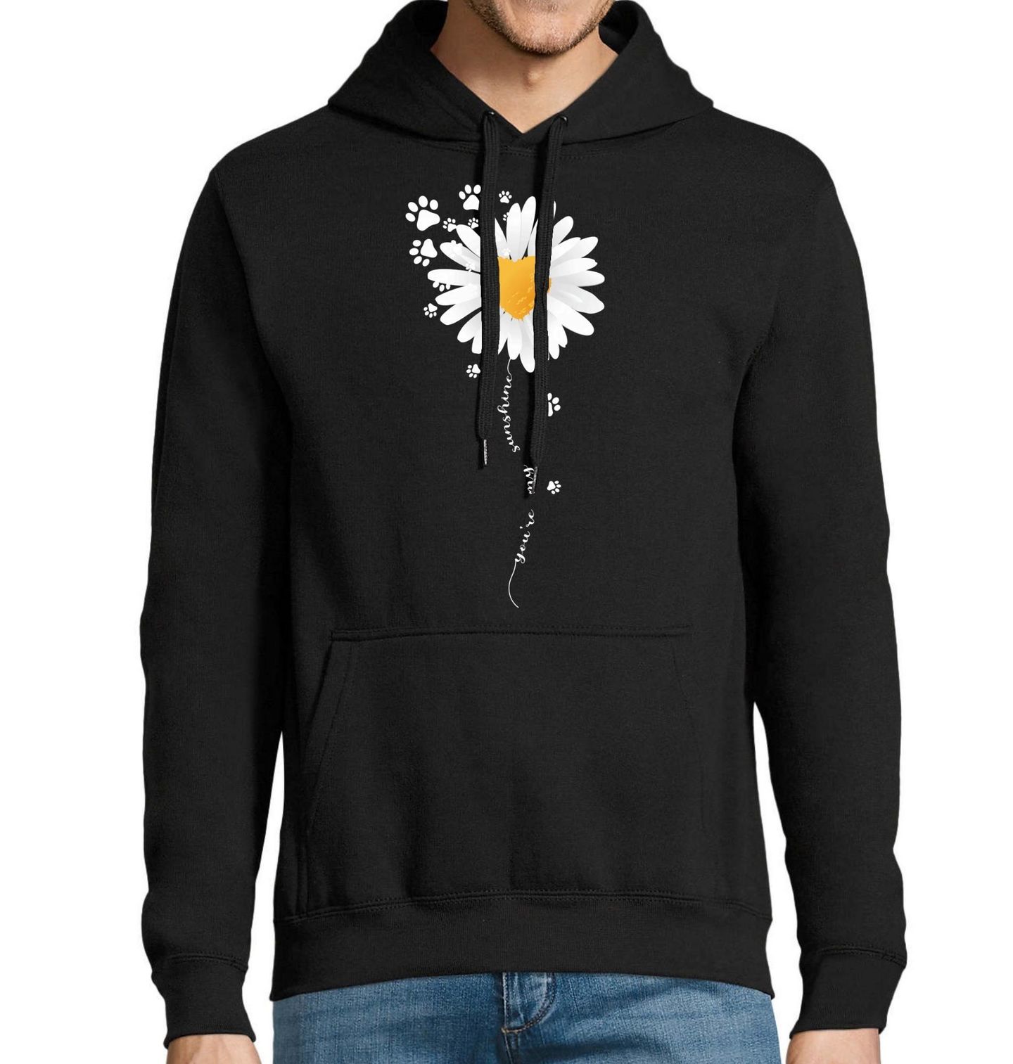 Pánská mikina Kopretina Lásky s Tlapkami. Jemný a roztomilý design s květinou a tlapkami doplňuje text „You are my sunshine“ (Jsi moje sluníčko). Tento design vyzařuje pozitivní emoce, radost a lásku ke zvířatům, což z něj dělá perfektní motiv pro každého milovníka něhy a přírody.