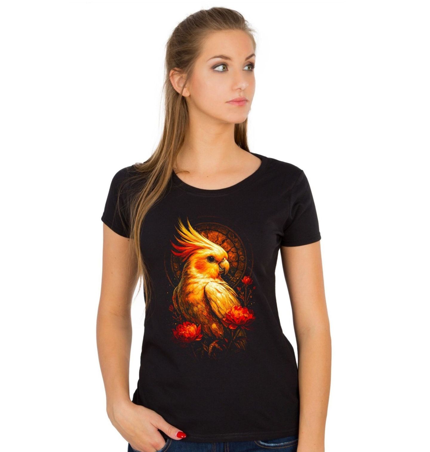 Dámské tričko Korela chocholatá. Papoušek druhu korela chocholatá, elegantní a oblíbený pták známý svou výraznou chocholkou a klidnou, přátelskou povahou. Korela chocholatá patří mezi nejčastěji chované papoušky díky své inteligenci, společenskosti a silné vazbě na člověka.