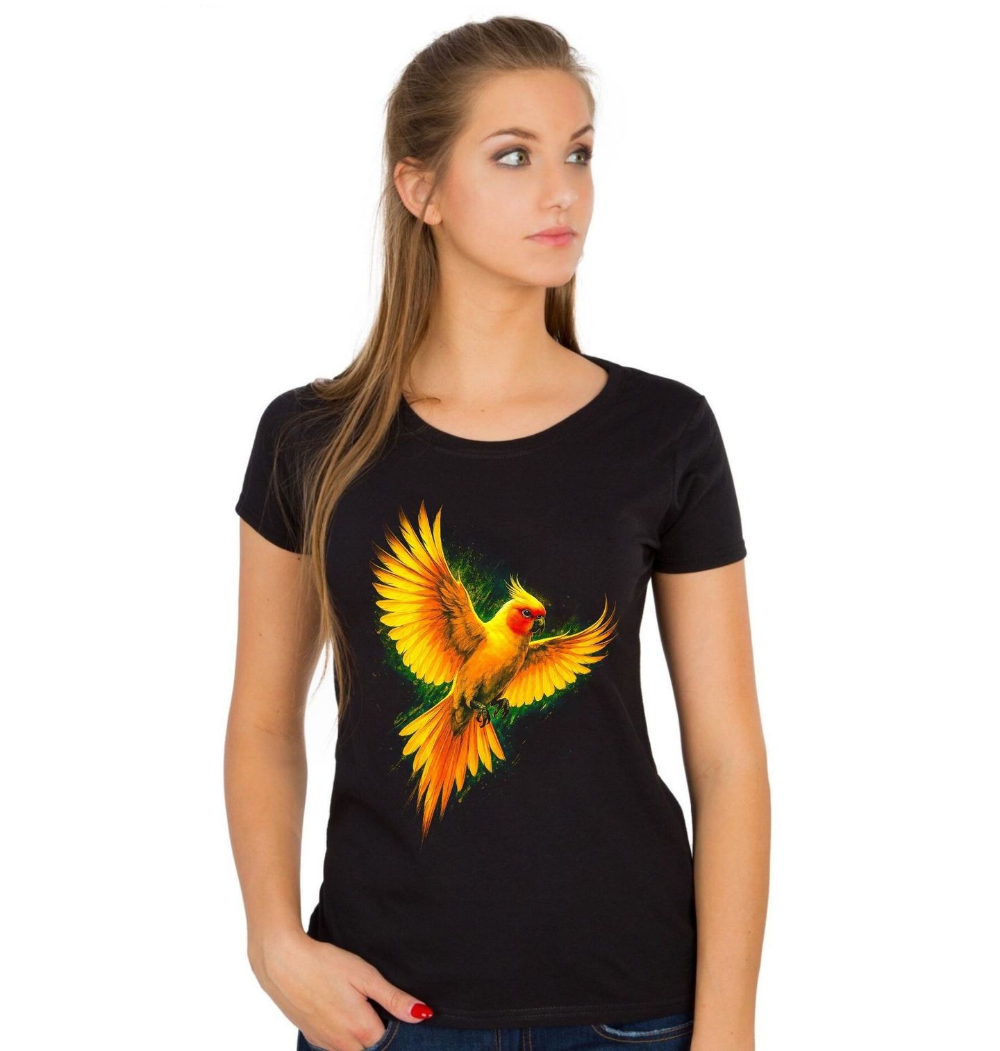 Dámské tričko Korela chocholatá v Letu. Papoušek korela chocholatá v okamžiku vzletu, kdy naplno vyniká krása roztažených křídel a zářivé žluté barvy. Tento inteligentní pták je známý svou přátelskou povahou, silnou vazbou na člověka a výraznými oranžovými lícemi, které jsou pro korelu typické.