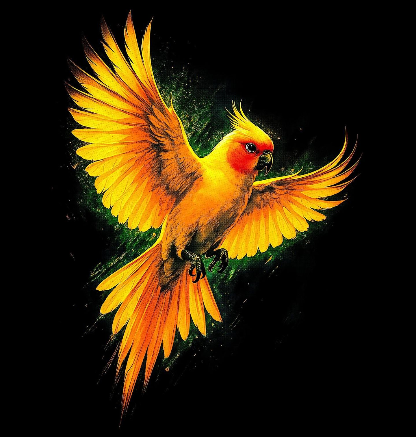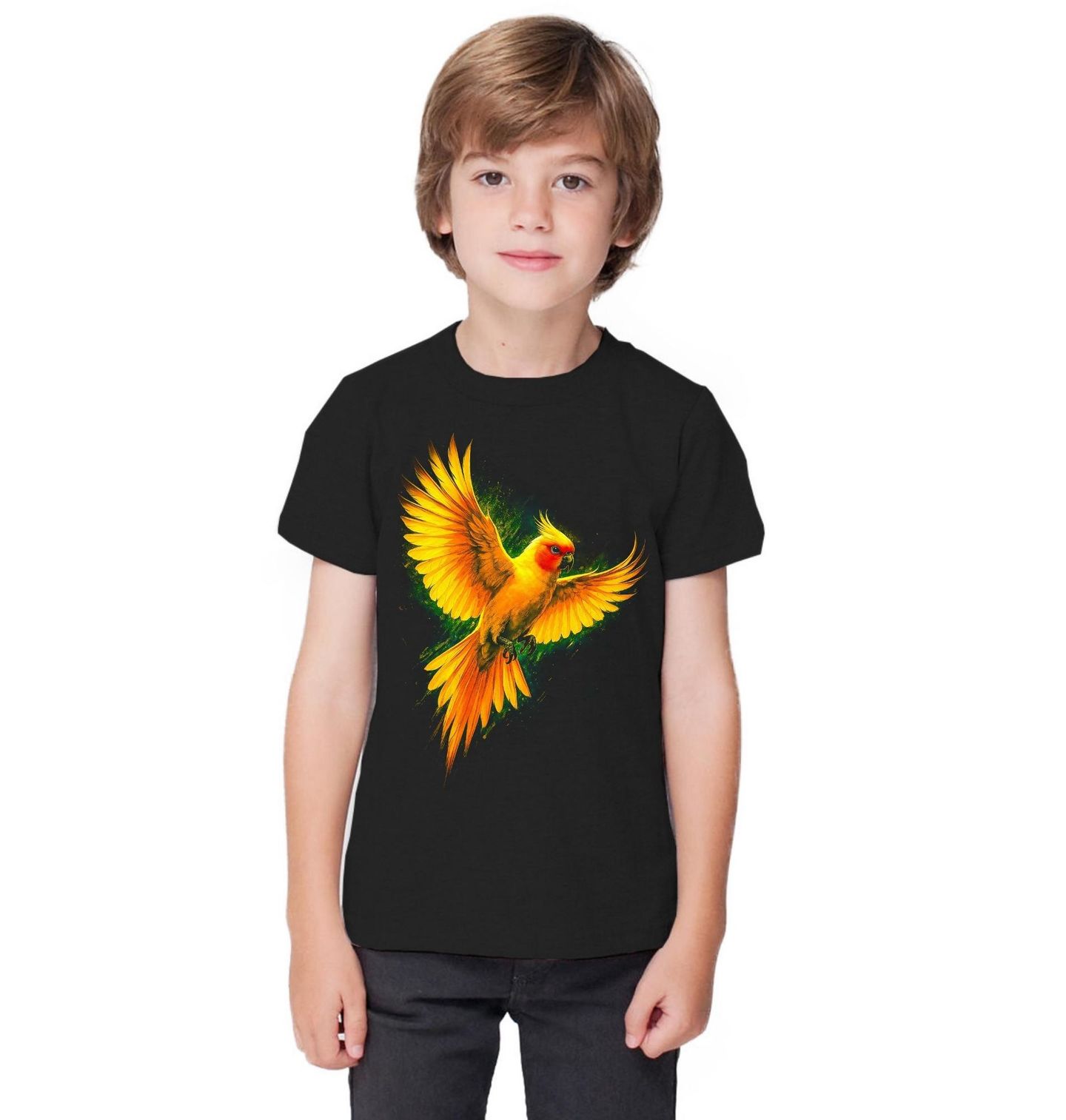 Dětské tričko Korela chocholatá v Letu. Papoušek korela chocholatá v okamžiku vzletu, kdy naplno vyniká krása roztažených křídel a zářivé žluté barvy. Tento inteligentní pták je známý svou přátelskou povahou, silnou vazbou na člověka a výraznými oranžovými lícemi, které jsou pro korelu typické.