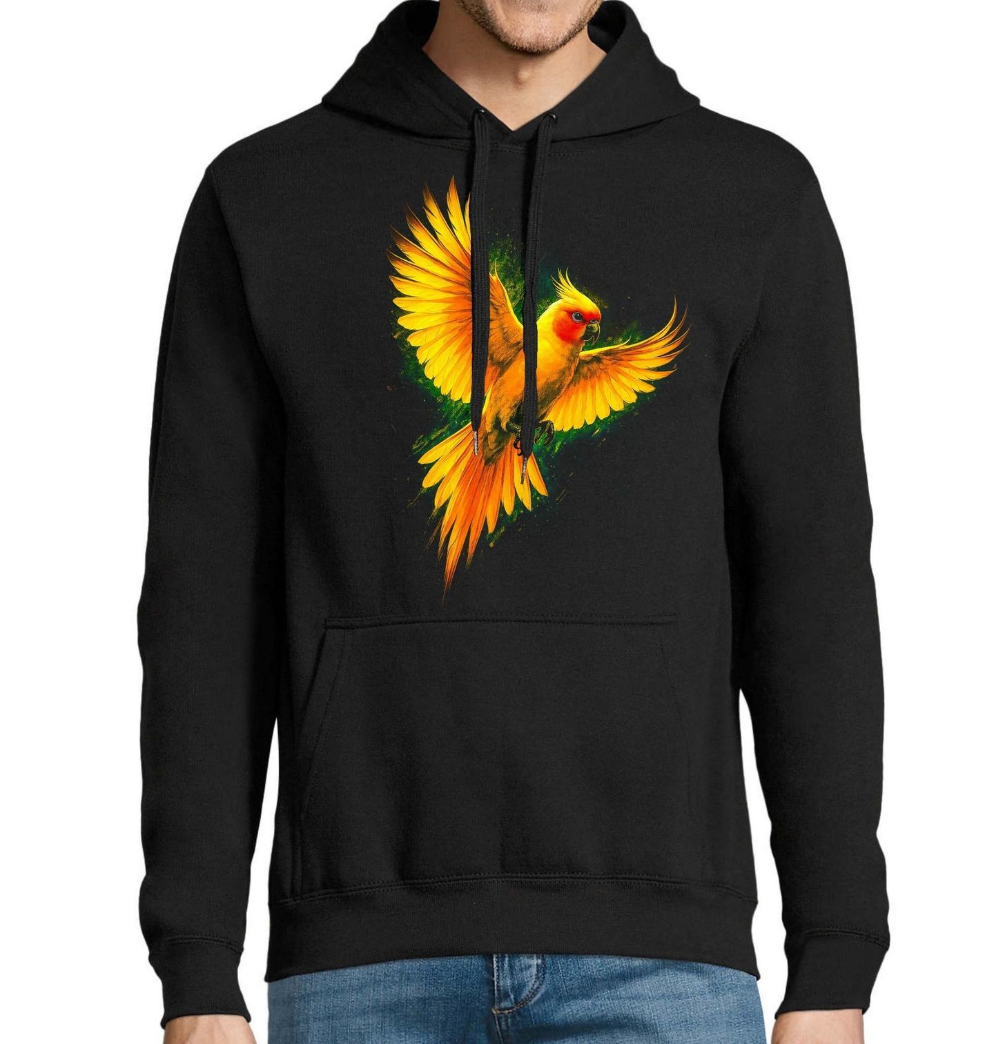 Pánská mikina Korela chocholatá v Letu. Papoušek korela chocholatá v okamžiku vzletu, kdy naplno vyniká krása roztažených křídel a zářivé žluté barvy. Tento inteligentní pták je známý svou přátelskou povahou, silnou vazbou na člověka a výraznými oranžovými lícemi, které jsou pro korelu typické.