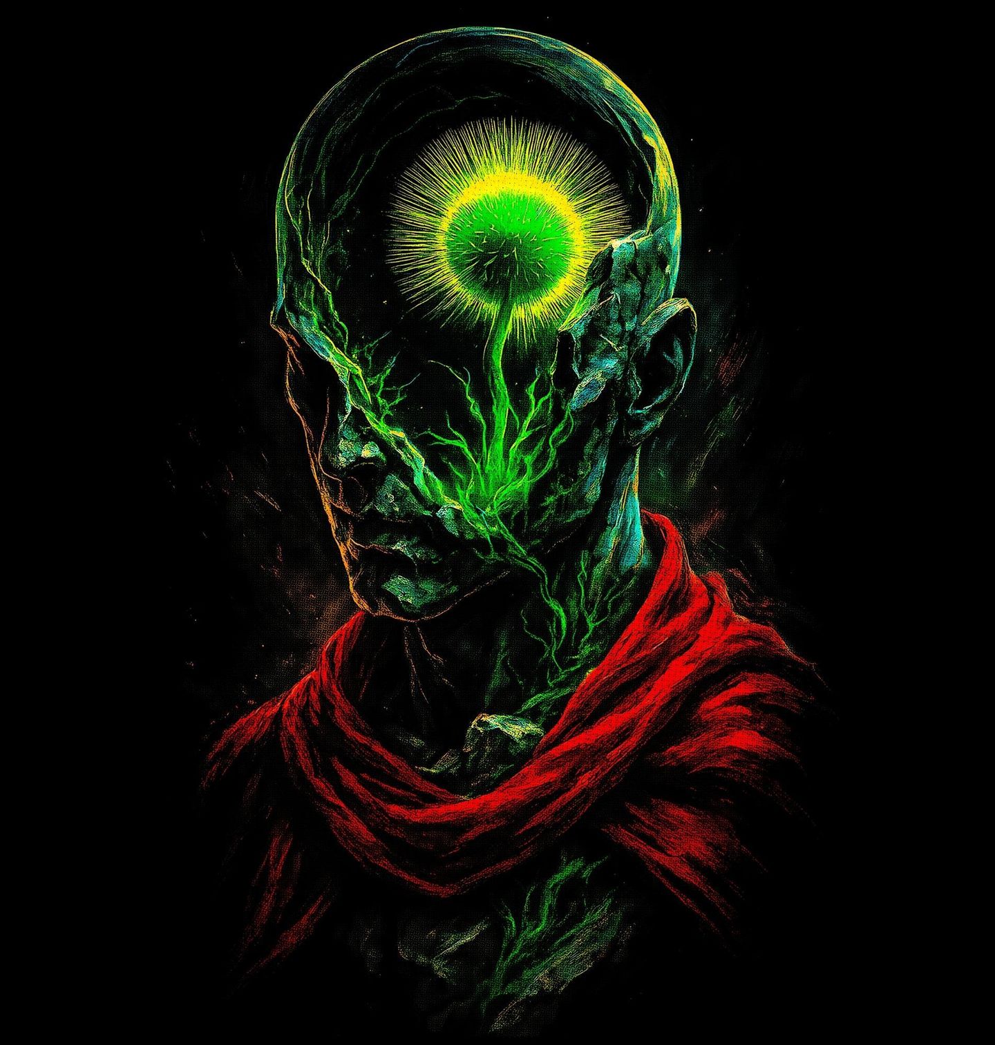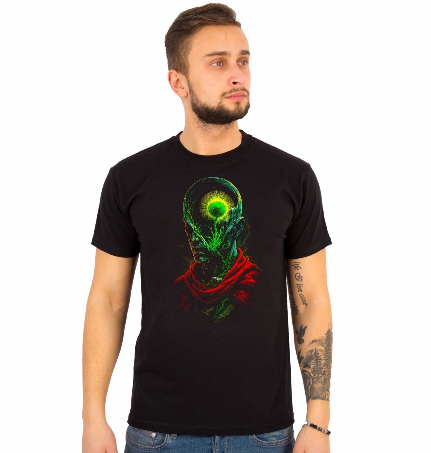 Pánské tričko Kořeny Vědomí. Tento jedinečný motiv zachycuje okamžik vnitřního osvícení, kdy se energie probouzí hluboko uvnitř člověka. Silueta postavy s pulzujícím světlem v hlavě symbolizuje vědomí, sílu mysli a duchovní transformaci. Z temnoty vystupuje zářivá energie, která prostupuje celým tělem a vytváří hypnotický kontrast mezi klidem a silou.