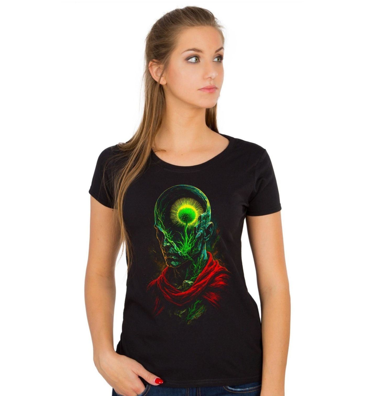 Dámské tričko Kořeny Vědomí. Tento jedinečný motiv zachycuje okamžik vnitřního osvícení, kdy se energie probouzí hluboko uvnitř člověka. Silueta postavy s pulzujícím světlem v hlavě symbolizuje vědomí, sílu mysli a duchovní transformaci. Z temnoty vystupuje zářivá energie, která prostupuje celým tělem a vytváří hypnotický kontrast mezi klidem a silou.