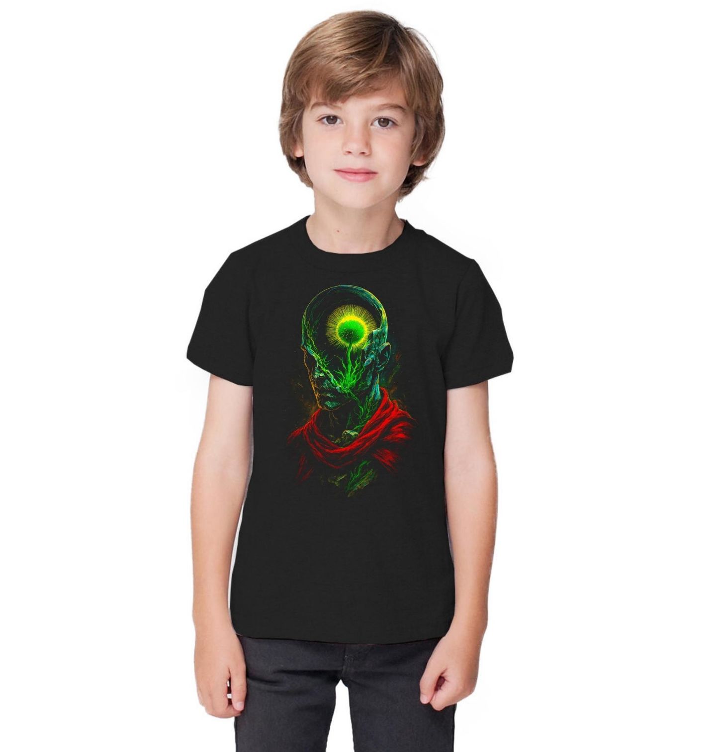 Dětské tričko Kořeny Vědomí. Tento jedinečný motiv zachycuje okamžik vnitřního osvícení, kdy se energie probouzí hluboko uvnitř člověka. Silueta postavy s pulzujícím světlem v hlavě symbolizuje vědomí, sílu mysli a duchovní transformaci. Z temnoty vystupuje zářivá energie, která prostupuje celým tělem a vytváří hypnotický kontrast mezi klidem a silou.