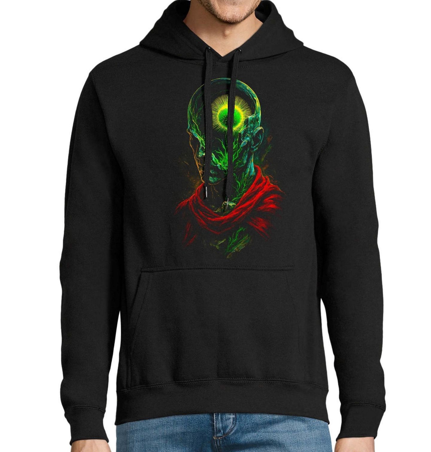 Pánská mikina Kořeny Vědomí. Tento jedinečný motiv zachycuje okamžik vnitřního osvícení, kdy se energie probouzí hluboko uvnitř člověka. Silueta postavy s pulzujícím světlem v hlavě symbolizuje vědomí, sílu mysli a duchovní transformaci. Z temnoty vystupuje zářivá energie, která prostupuje celým tělem a vytváří hypnotický kontrast mezi klidem a silou.