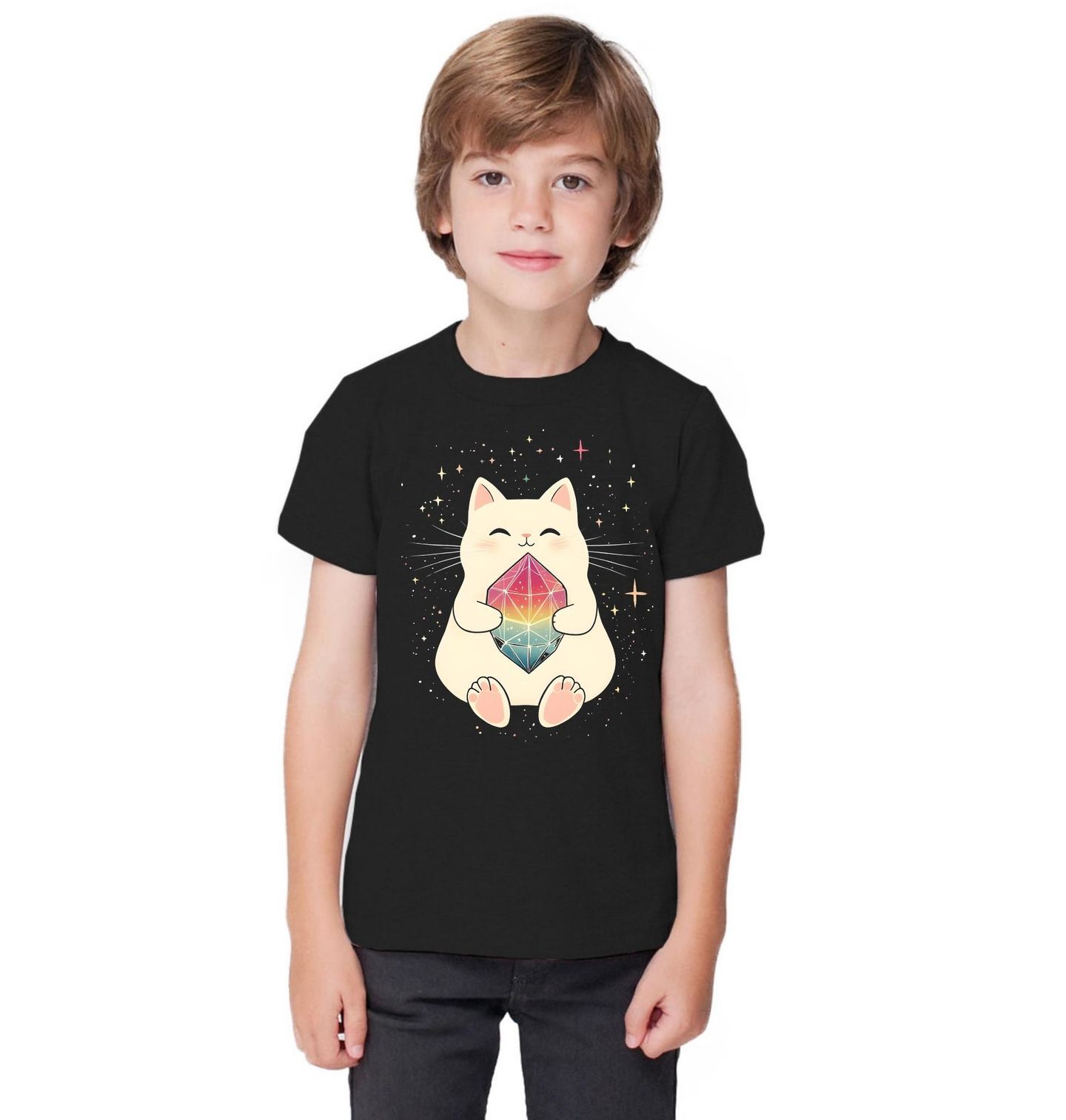 Dětské tričko Kosmická Kočka s Krystalem. Ilustrace zobrazuje spokojenou postavu, kterou je kočka, držící zářící duhový krystal na pozadí plném hvězd. Celý motiv působí uklidňujícím a pozitivním dojmem. Minimalistický styl spolu s pastelovými barvami a vesmírným pozadím dělají z tohoto designu ideální volbu pro milovníky roztomilých ilustrací, koček a fantazie.