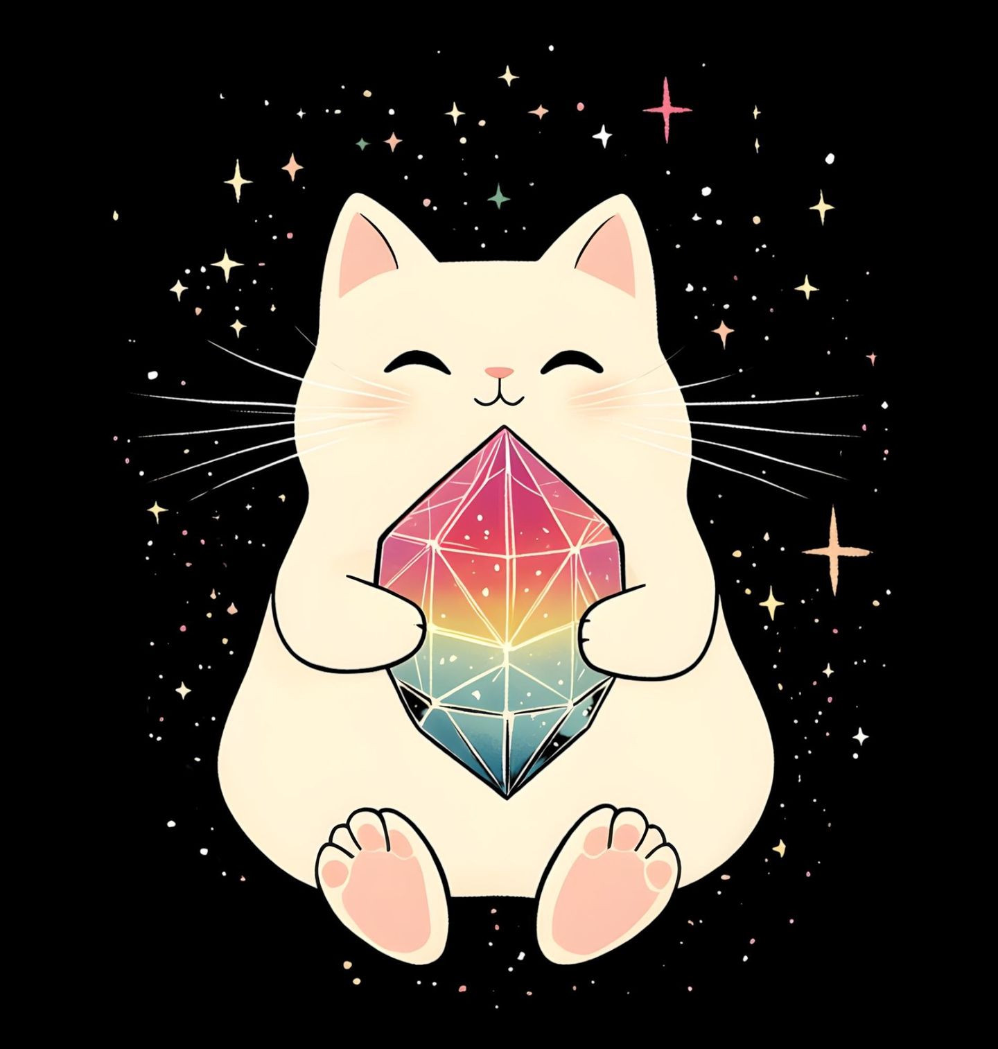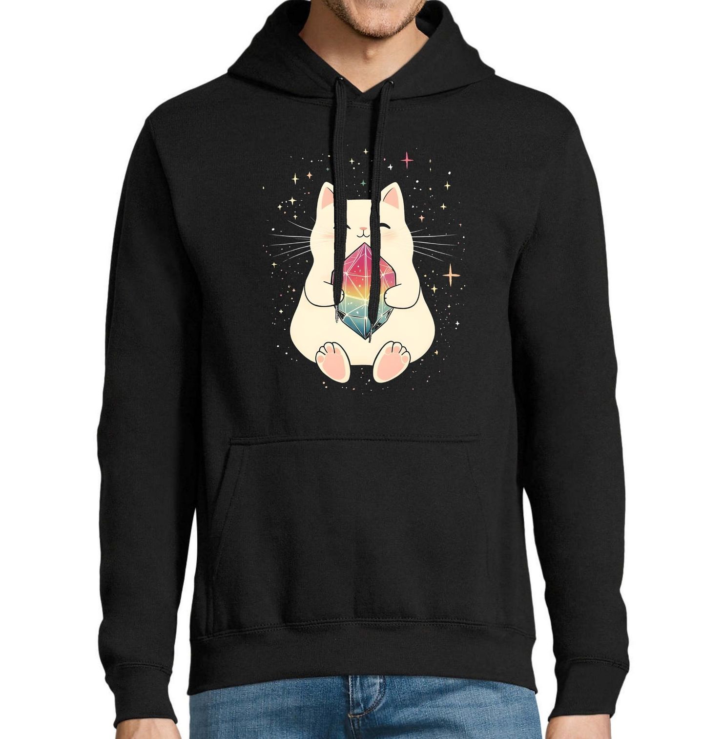 Pánská mikina Kosmická Kočka s Krystalem. Ilustrace zobrazuje spokojenou postavu, kterou je kočka, držící zářící duhový krystal na pozadí plném hvězd. Celý motiv působí uklidňujícím a pozitivním dojmem. Minimalistický styl spolu s pastelovými barvami a vesmírným pozadím dělají z tohoto designu ideální volbu pro milovníky roztomilých ilustrací, koček a fantazie.