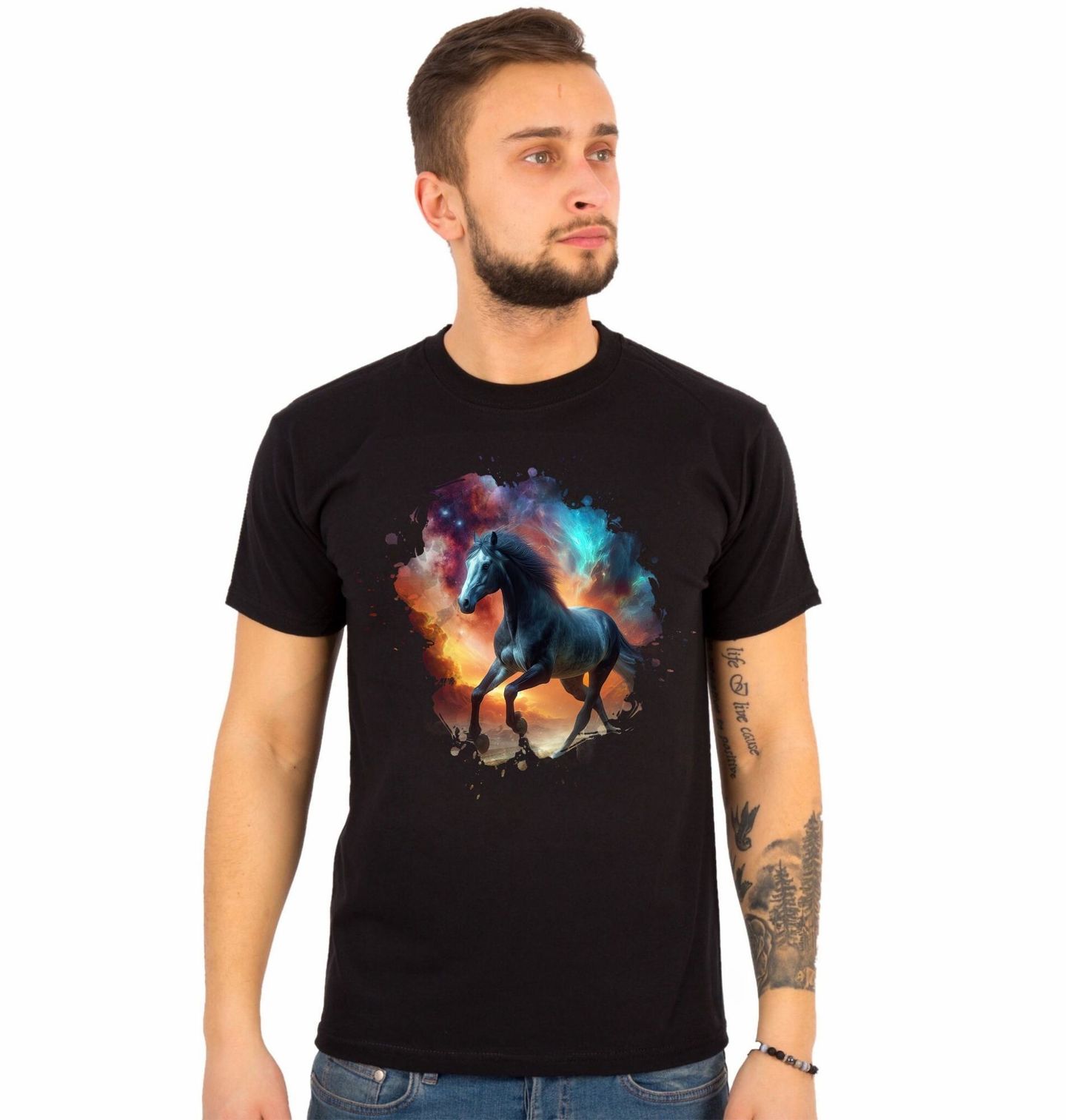 Pánské tričko Kosmický Kůň mezi Galaxiemi. Tento originální fantasy motiv zobrazuje koně jako kouzelnou bytost putující vesmírem mezi barevnými galaxiemi a hvězdnou energií. Magická atmosféra, světelné mlhoviny a kosmické barvy vytvářejí dojem, že koně zde nejsou obyčejná zvířata, ale symbol svobody, síly a nekonečna.