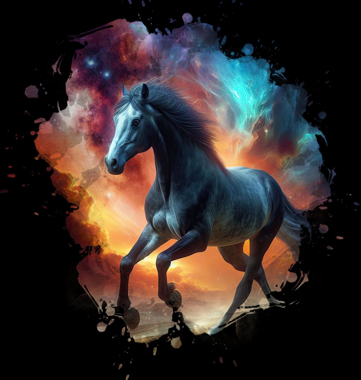 Dámské tričko Kosmický Kůň mezi Galaxiemi. Tento originální fantasy motiv zobrazuje koně jako kouzelnou bytost putující vesmírem mezi barevnými galaxiemi a hvězdnou energií. Magická atmosféra, světelné mlhoviny a kosmické barvy vytvářejí dojem, že koně zde nejsou obyčejná zvířata, ale symbol svobody, síly a nekonečna.