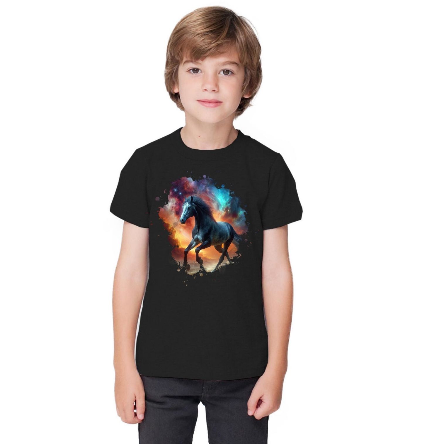 Dětské tričko Kosmický Kůň mezi Galaxiemi. Tento originální fantasy motiv zobrazuje koně jako kouzelnou bytost putující vesmírem mezi barevnými galaxiemi a hvězdnou energií. Magická atmosféra, světelné mlhoviny a kosmické barvy vytvářejí dojem, že koně zde nejsou obyčejná zvířata, ale symbol svobody, síly a nekonečna.