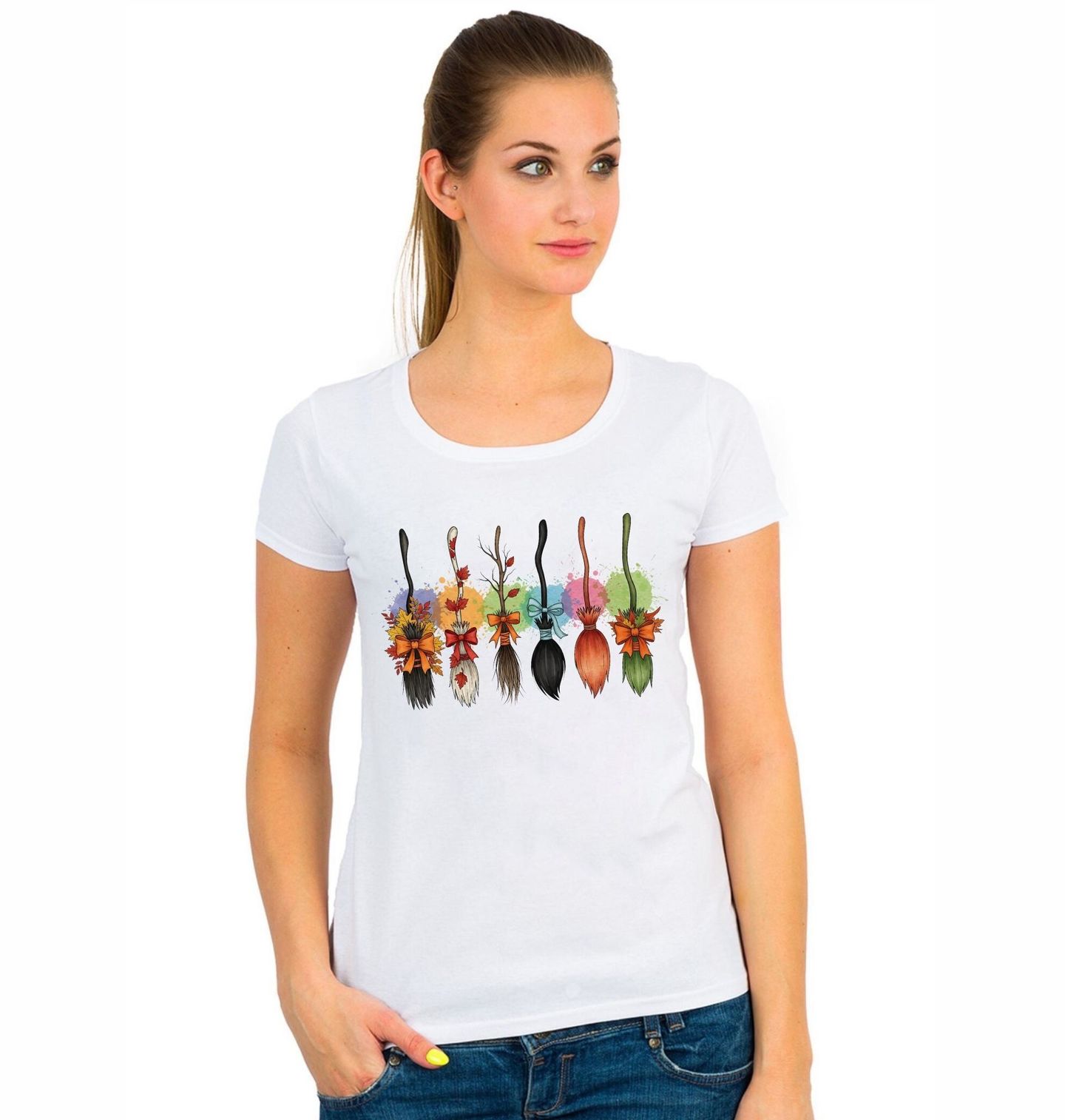 Dámské tričko Košťata čarodějnic. Originální motiv plný barevných kouzel – ideální pro milovníky magie, podzimu a čarodějnické estetiky! Každé koště je ozdobeno mašlí a laděno do jiných tónů, což z něj dělá skvělý motiv. Čarodějnice i poctivě vyčesané koště jsou zárukou skvělého kouzelného stylu.
