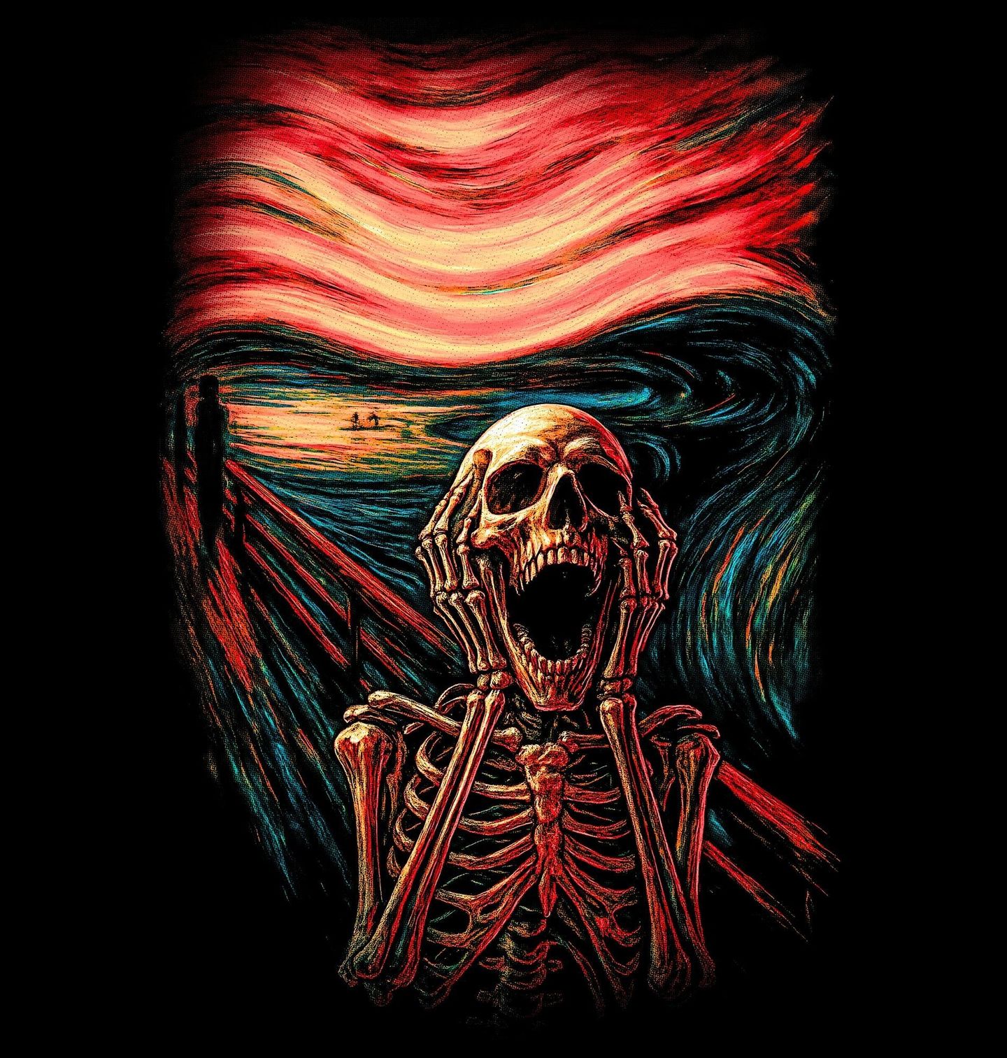 Pánské tričko Kostlivcův Výkřik. Výkřik The Scream je expresionistický obraz, nejvýznamnější dílo norského malíře Edvarda Muncha. Zachycuje výkřikem znetvořenou postavu s lysou lebkou na pozadí stylizované krajiny a krvavého nebe. Toto je parodicky stylizovaný kostlivec v póze slavného „Výkřiku“. Tato parodie přináší temný a zároveň umělecký pohled na jednu z nejznámějších kompozic v historii umění.