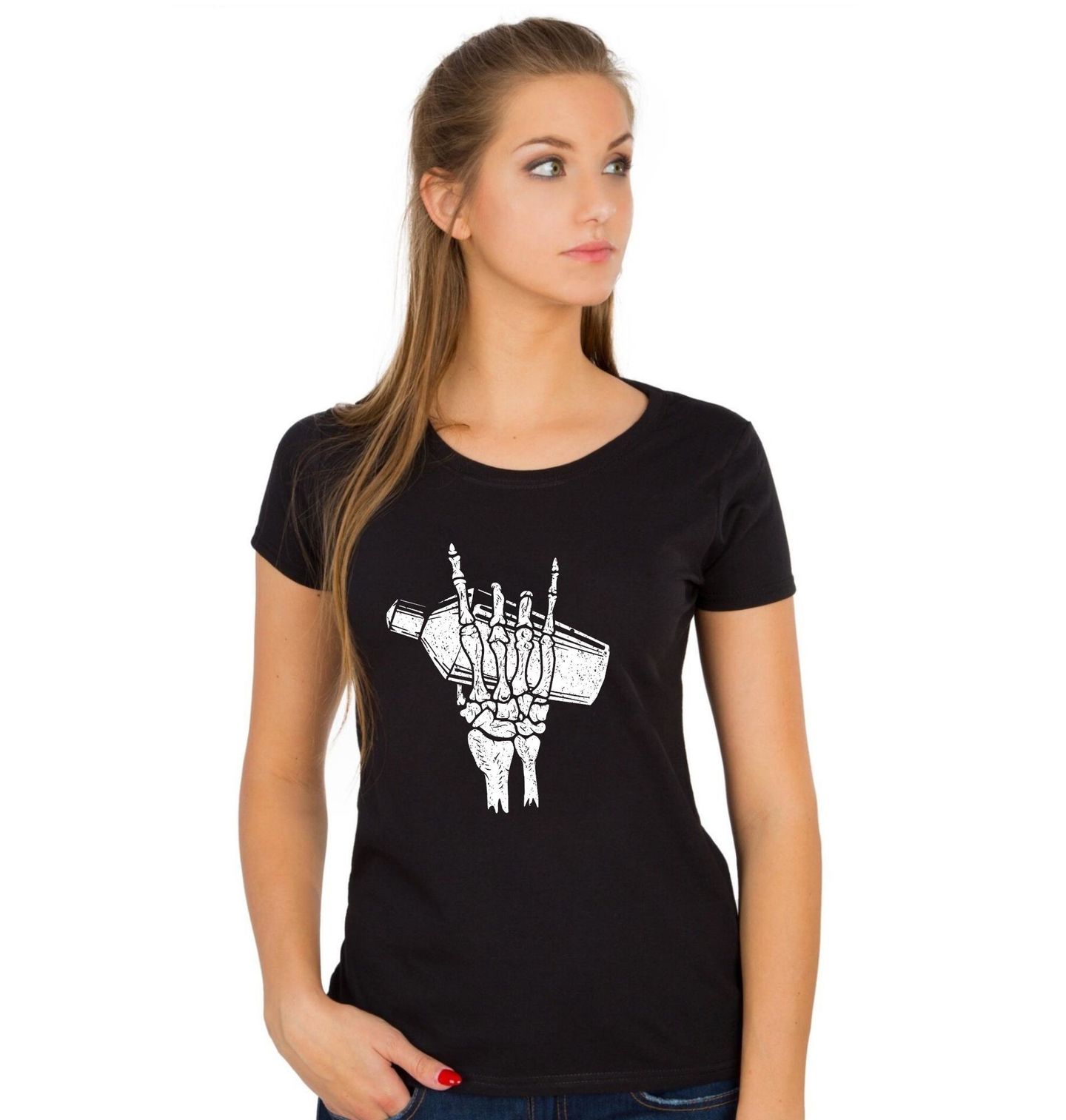 Dámské tričko Kostlivec Barman se Shakerem. Stylový a vtipně temný motiv, ve kterém hraje hlavní roli kostlivec, který drží v ruce shaker jako pravý barman. Design spojuje rebelský humor, barovou atmosféru a téma alkohol, takže je jako stvořený pro každého, kdo miluje dobrou zábavu a každou párty.