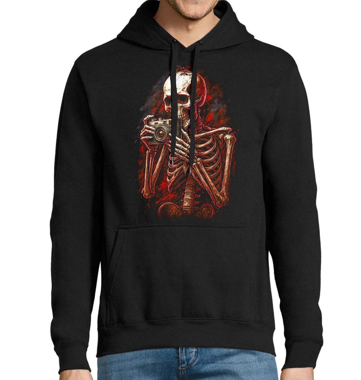 Pánská mikina Kostlivec Fotograf. Originální a výrazný motiv zachycuje postavu, kde kostlivec drží fotoaparát a soustředěně míří objektivem. Tento design spojuje temnou estetiku s uměním fotografování a vytváří jedinečný vizuální zážitek, který zaujme na první pohled. Detailní zpracování kostí a starého fotoaparátu dodává ilustraci autentický a lehce vintage nádech.