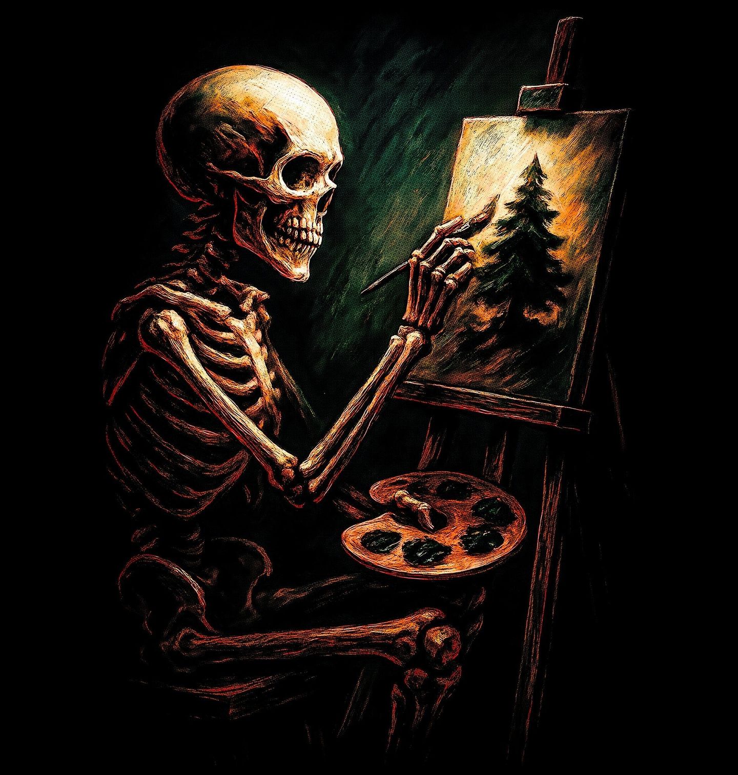 Pánské tričko Kostlivec Malíř u Plátna. Originální a umělecký motiv zobrazuje scénu, kde kostlivec jako malíř sedí u stojanu a soustředěně tvoří obraz. Temná atmosféra a detailní zpracování dodávají ilustraci jedinečný charakter, který zaujme každého milovníka umění. Motiv kostlivec malíř spojuje kreativitu s tajemnem a symbolikou pomíjivosti.