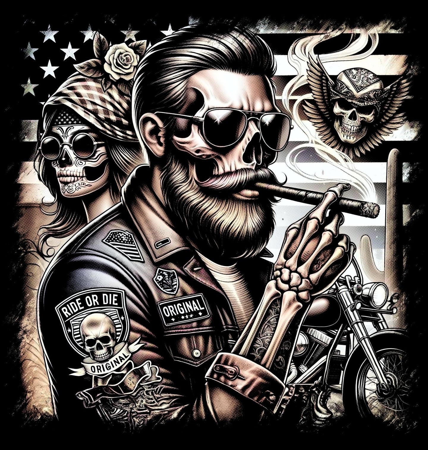 Dámské tričko Kostlivec Motorkář s Doutníkem. Stylový motiv pro každého rebela – motorkář s charismatem, lebkou místo tváře a doutníkem v ruce. V pozadí černobílá americká vlajka, motorová klasika a tetovaný styl podtrhují motorkářskou kulturu v její nejčistší podobě. Design je ideální pro fanoušky biker estetiky, kteří věří v heslo „Ride or Die“.