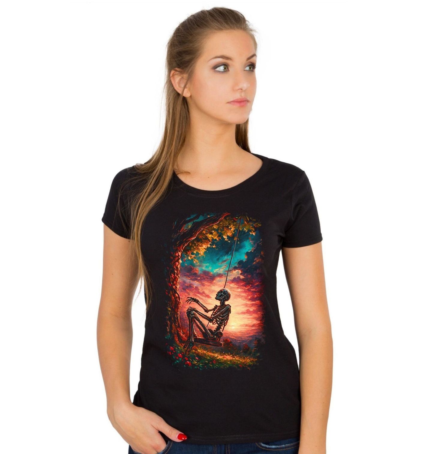 Dámské tričko Kostlivec na Houpačce. Silně emotivní a vizuálně podmanivý motiv, který zachycuje nečekaný kontrast mezi temnotou a klidem. Na ilustraci sedí kostlivec na houpačce zavěšené pod starým stromem, zatímco barevná obloha v pozadí vytváří snovou a téměř magickou atmosféru. Motiv kostlivec a houpačka symbolizuje vzpomínky, pomíjivost i návrat k jednoduchosti a tichu.