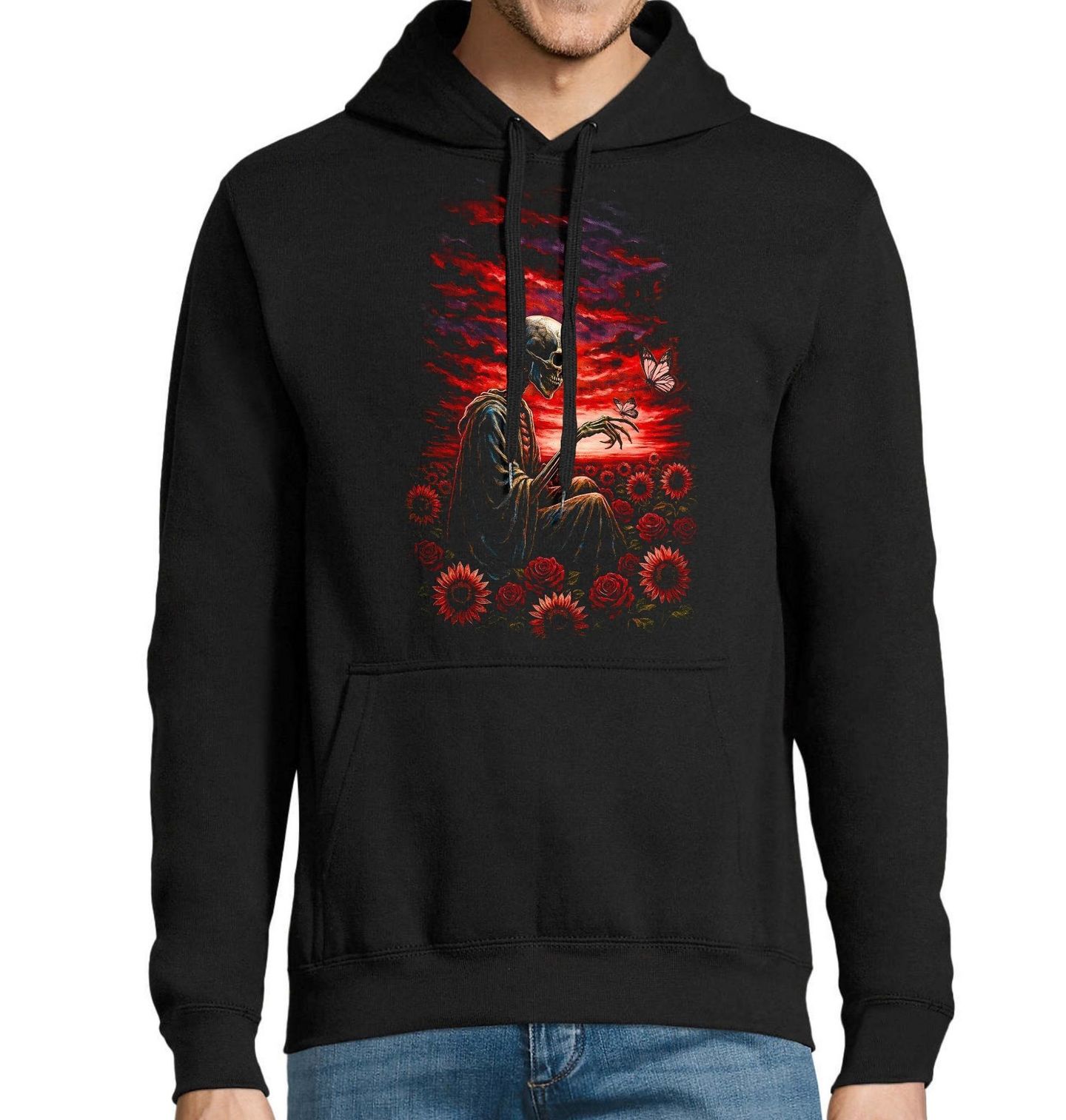 Pánská mikina Kostlivec na Slunečnicovém Poli. Silný a zároveň poetický motiv, který spojuje temnotu s krásou přírody. Na ilustraci sedí kostlivec obklopený květinami, mezi nimiž vyniká slunečnice jako symbol života, světla a naděje. Jemný motýl usedající na jeho ruku dodává celé scéně křehkost a hluboký význam. Pokud hledáte originální motiv, kde kostlivec v harmonii se slunečnice a motýl vytváří jedinečný příběh o proměně a rovnováze, tento design vás osloví na první pohled.