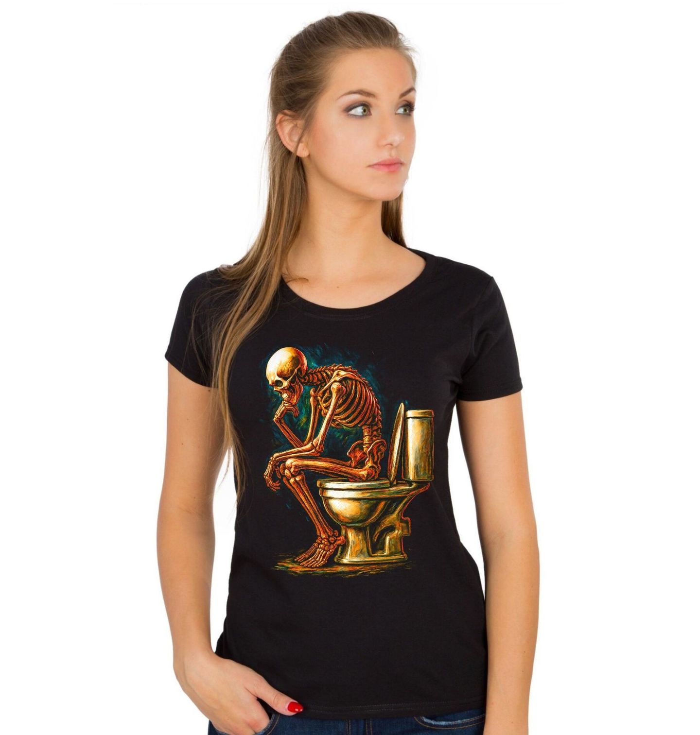 Dámské tričko Kostlivec na WC. Originální a humorný motiv zachycuje scénu, kde kostlivec sedí na záchod a zamyšleně přemýšlí nad životem. Tento design spojuje temný styl s nadsázkou a každodenní realitou, což z něj dělá nepřehlédnutelný kousek. Motiv kostlivec na wc zaujme každého, kdo má rád černý humor a netradiční grafiku.